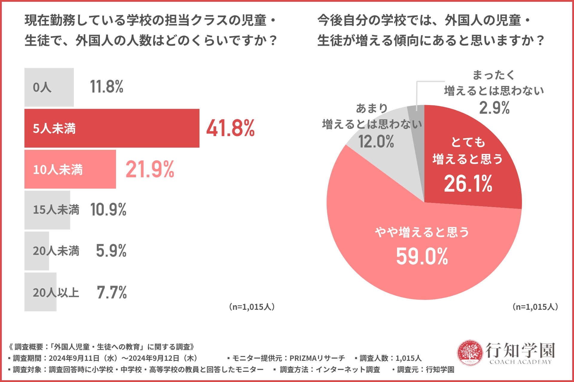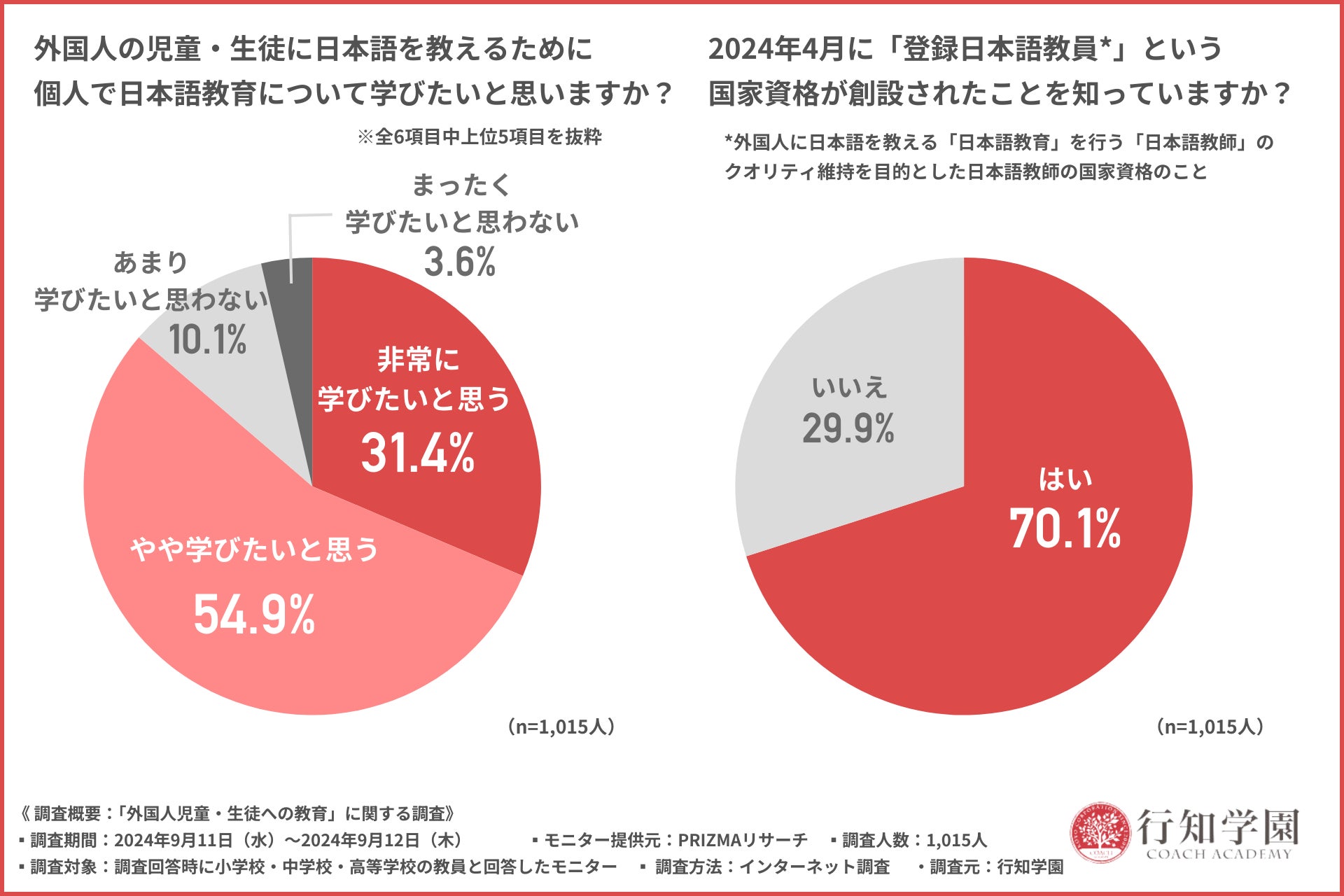 2024年9月に「外国人児童・生徒への教育」に関する調査を教員1015人に実施したところ、(上記画像の左図参照)「外国人の児童・生徒に日本語を教えるために、個人で日本語教育について学びたいと思いますか?」と質問したところ、8割以上の方が『非常に学びたいと思う(31.4%)』または『やや学びたいと思う(54.9%)』という回答になりました。