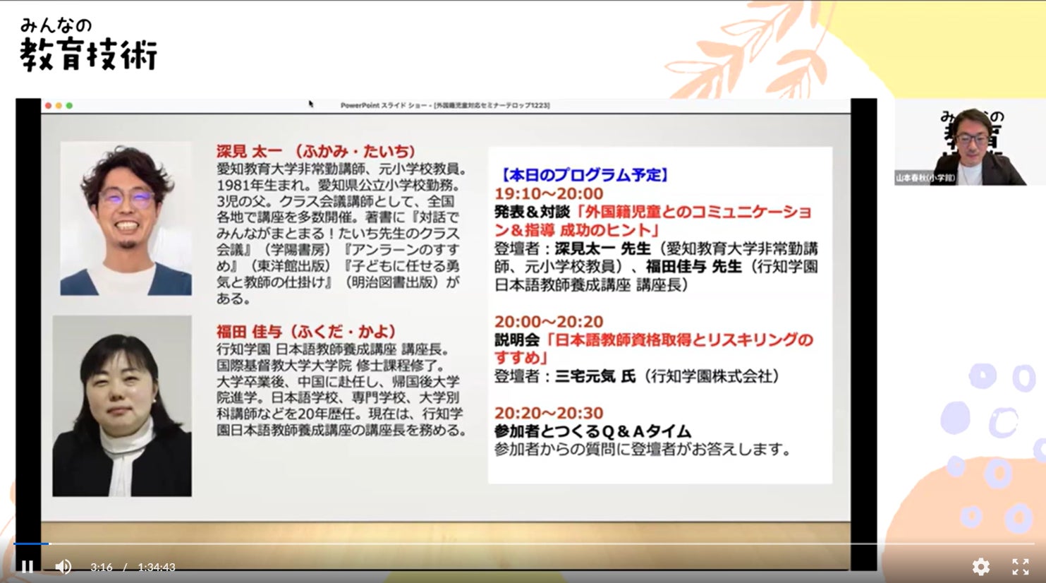 2024年12月23日(月)に、小学館と共催で『みんなの教育技術』にてオンラインセミナーを実施いたしました。児童の7割が外国籍というクラス担任をしていた元小学校教員・深見太一氏と、20年以上にわたり日本語教師として外国人への日本語教育に携わってきた行知学園日本語教師養成講座の講座長福田佳与氏が、それぞれの立場から、明日からの授業づくりに活かせる具体的な指導のポイントやコミュニケーション術について意見交換をしました。