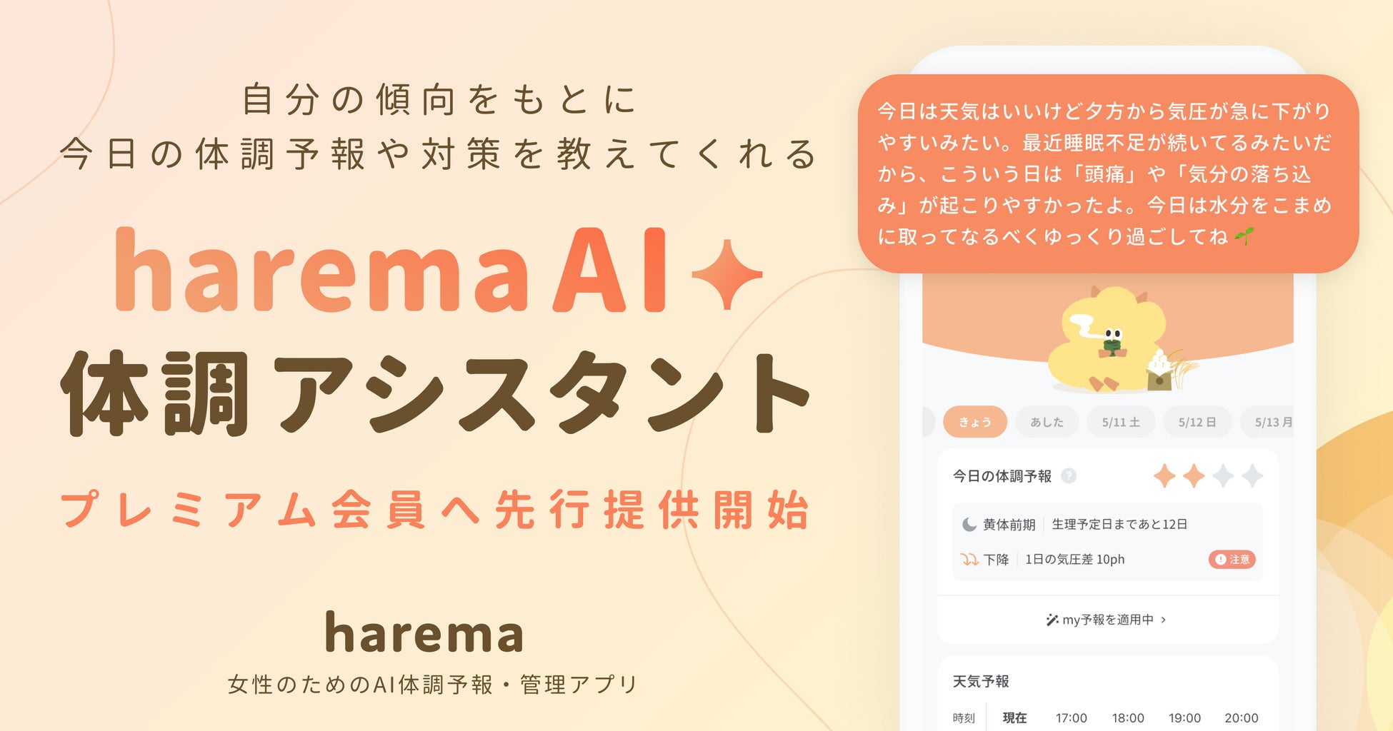 不調に悩む女性の毎日を支えるAI体調予報・管理アプリ「harema」、パーソナライズされたAI体調アシスタント機能を提供開始