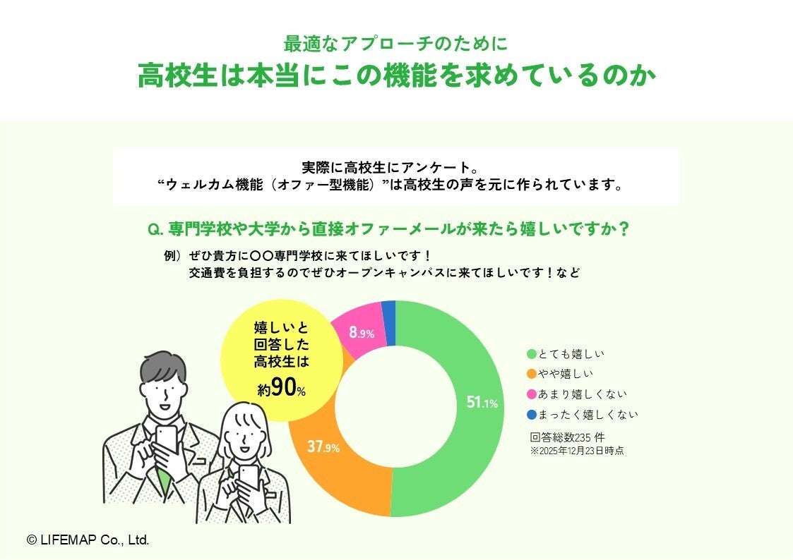 また、本機能は高校生へのアンケート結果をもとに設計されています。「専門学校や大学から直接オファーが届いたら嬉しいか」という問いに対し、約90%の高校生が「嬉しい」と回答しました。実際のニーズに基づいた設計とすることで、「選ぶ」だけでなく「選ばれる」体験を提供し、進路選択に対する不安の軽減と前向きな行動を後押しします。
