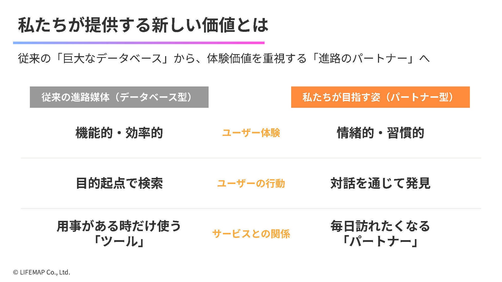 従来の進路媒体は、資料請求やオープンキャンパスの申し込みといった、特定のタイミングでのみ利用される「点での接触」にとどまっていました。その結果、サービスへの愛着が生まれにくく、90%以上のユーザーが必要時以外は離脱する状況となっています。また、情報量だけでは意思決定を支えきれないという限界も見えてきました。当社は、用事がある時だけ使う「ツール」から、日常的に寄り添う「パートナー」へと、進路情報の在り方を再定義します。