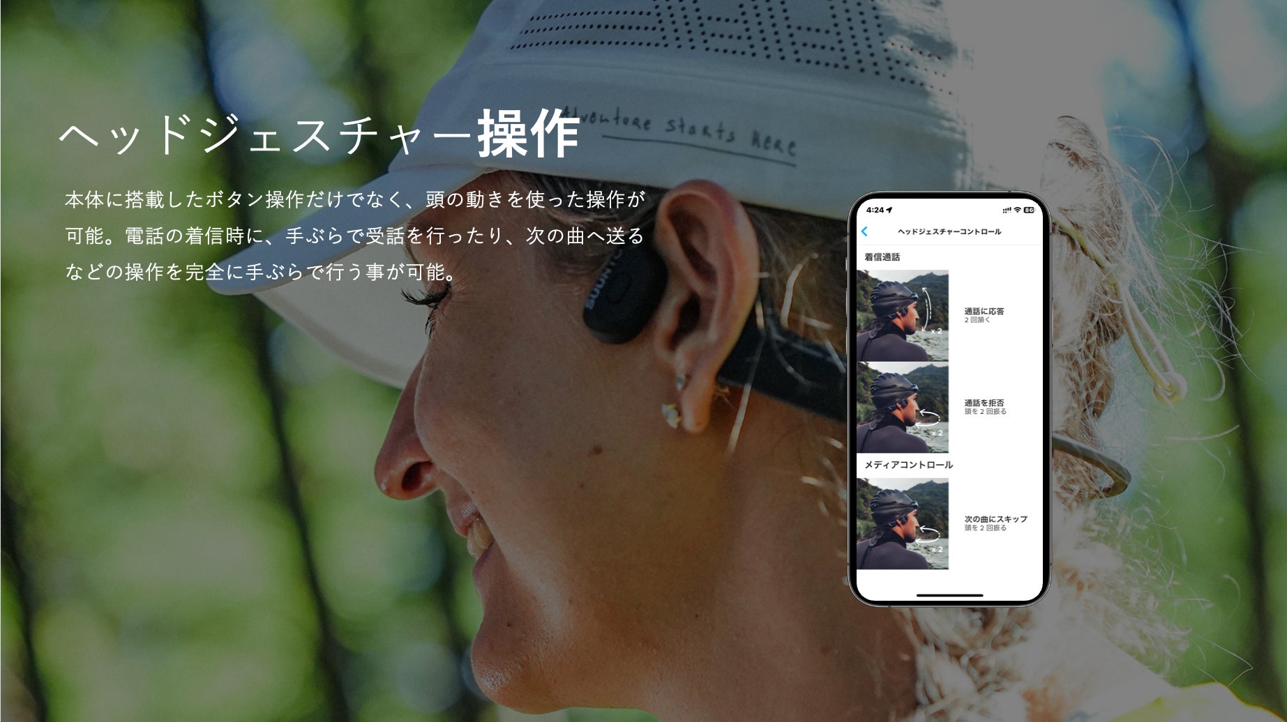 頭の動きで楽曲操作や音量調整、通話応答が可能。手を使わずに操作できるため、集中を妨げません。