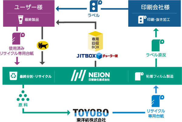 「資源循環プロジェクト」は、これまで資源として回収・再利用されることなく廃棄・焼却されていたラベル台紙を、再生PET合成紙製の「リサイクル専用台紙」に置き換え、使用後に有価回収をし、マテリアルリサイクル*³を行うことで、同じリサイクル専用台紙の原料として使用し、ラベル台紙の廃棄をゼロにする、環境に配慮した取り組みです。