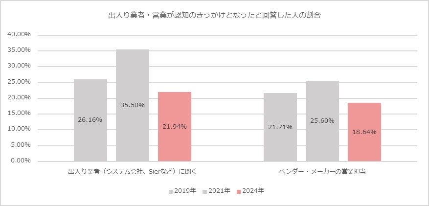 「認知のきっかけ」となった情報収集源に「出入り業者」「ベンダー・メーカーの営業担当」と回答した人は2024年が最も低く、2021年が最も高かった。コロナ禍において、展示会など、リアルの場における情報収集が制限されたことにより、以前から付き合いのある人からの情報収集が活発になったと推察される。行動制限が解除された2024年においては情報収集源が増えたことにより、コロナ前の2019年よりも付き合いのある人からの情報収集割合は低下している。