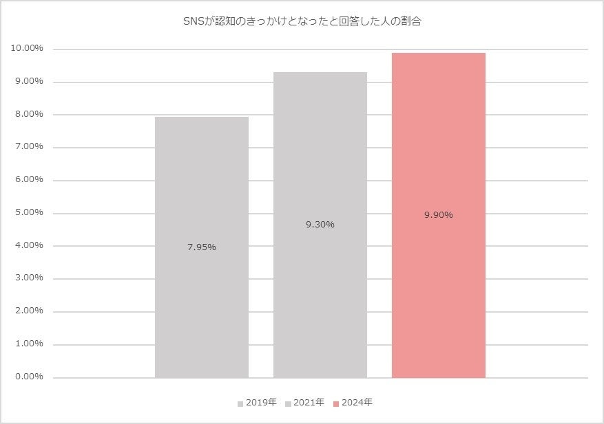 一方で、2019年~2024年にかけて情報収集の割合が上昇しているのがSNSだ。情報収集のオンライン化が進む中で、企業側のSNS活用が進んだこともあり、2024年では9.9%とおよそ1割の人が、SNSが「認知のきっかけ」となったと回答した。