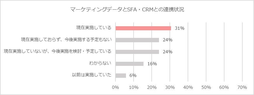 「マーケティングデータとセールスデータの連携」への取り組みについて、非SaaSマーケター向けに行った調査においては30.6%が実施中と回答。実施企業はSaaSに比べ約半数に留まるものの、2021年の前回調査14.7%から大幅に上昇している。また、24.0%が今後実施予定と回答しており、更なる取り組みの加速が見込まれる。