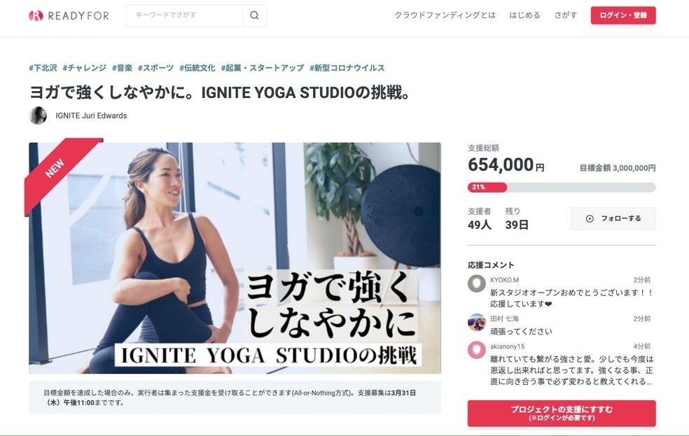 初回900%目標達成した人気ヨガスタジオIGNITE YOGAクラウドファンディング第2弾スタート!