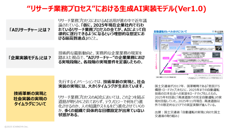 株式会社一矢(代表取締役:福田大記、以下 ICHINOYA)はこの度、部門業務における「インテリジェンス体制」へのAI組み込みが発展していくビジョンを描いた「AIリサーチャーの企業実装モデル(Ver1.0)」を発表しました。