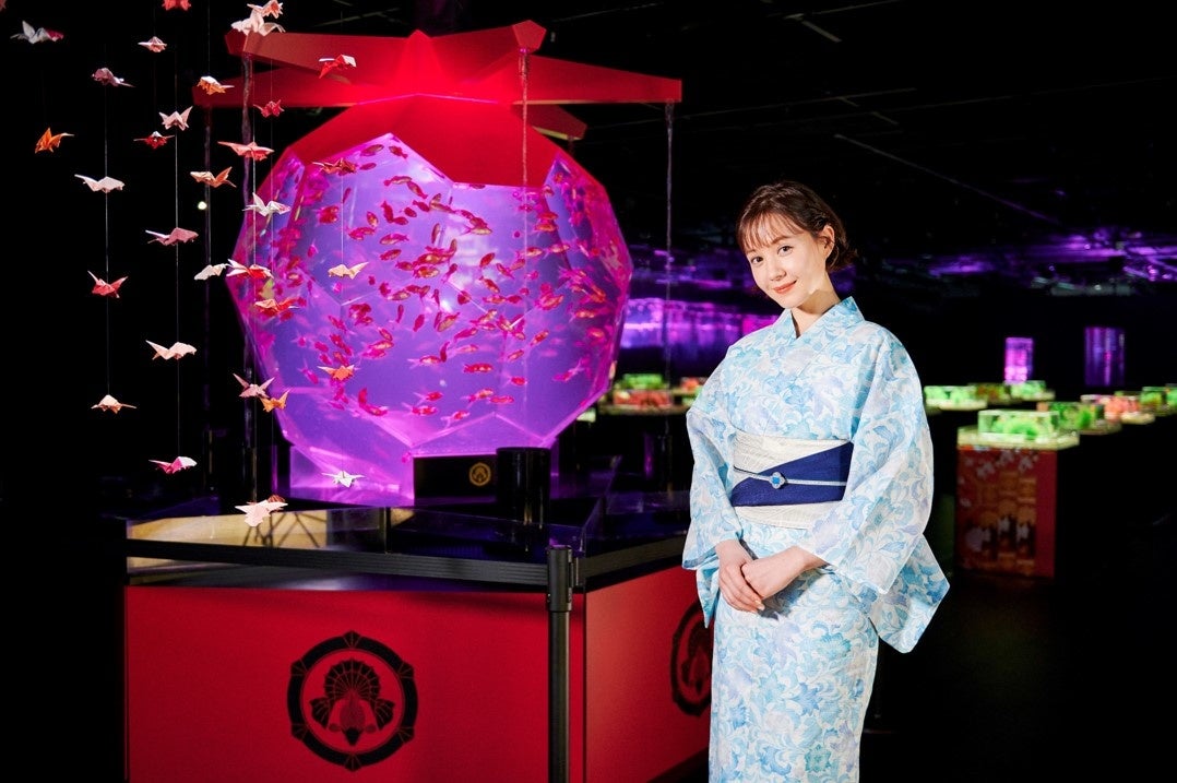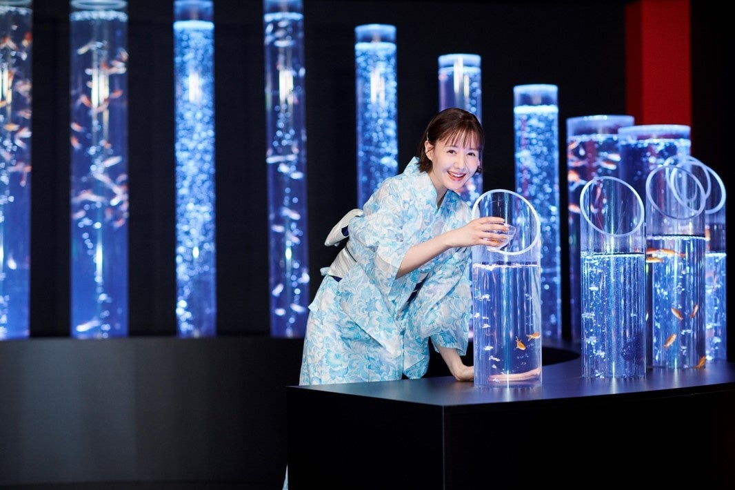 トリンドル玲奈さんが自ら金魚を水槽に入れ、「金魚の竹林」の最後のピースを完成させてくださいました。