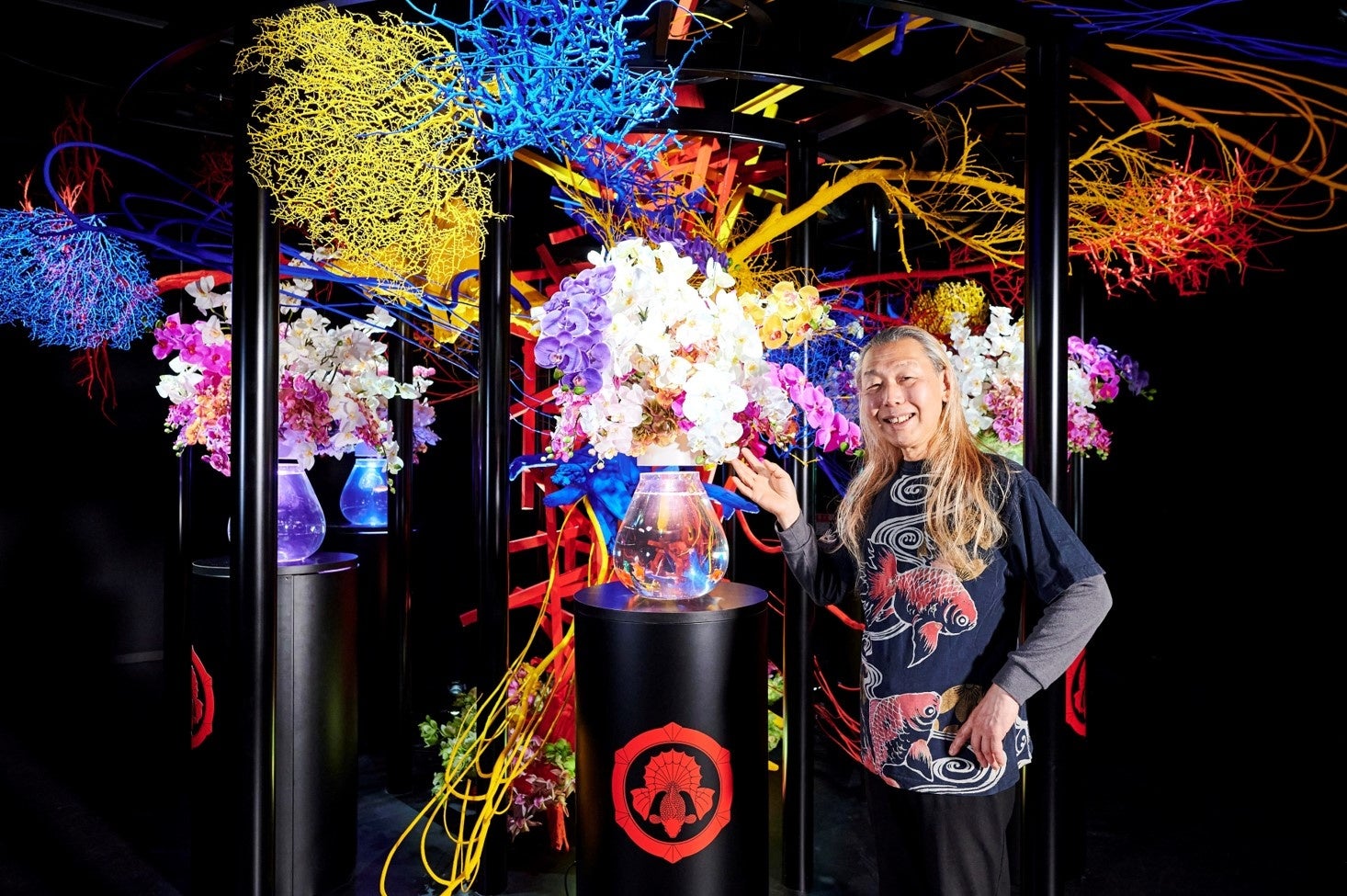 アートアクアリウムという唯一無二のアートと、日本の伝統美術の共演による進化したアートの表現を目指し、日本を代表する華道家である假屋崎省吾氏とのコラボレーションが実現しました。アートアクアリウムではこれまでも“花”をテーマにした作品を展示してきましたが、華道家による生花を用いた演出は初めての試みです。静のいけばな、動の金魚という、対極にありながらも、混ざり合い、相乗される至上の美が、皆様をお迎えいたします。