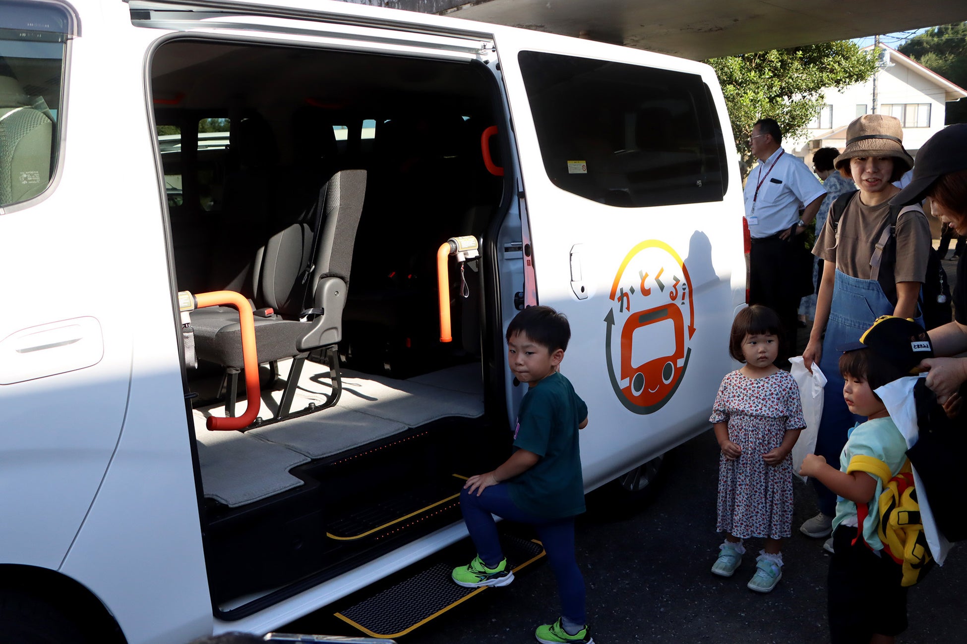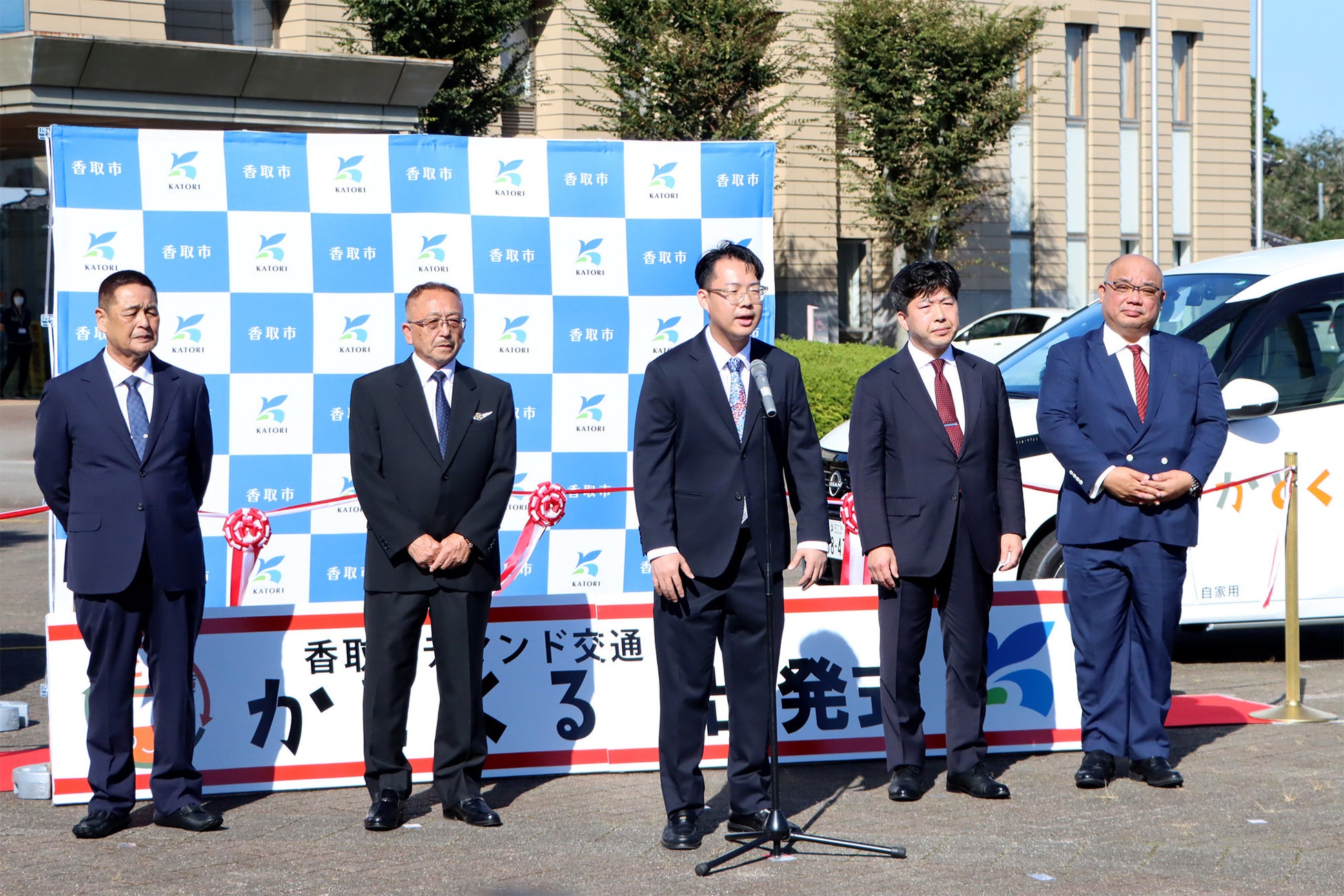 出発式当日は、香取市長、「かとくる」愛称考案者の小学生、運行を担う地域タクシー会社代表、当社代表取締役CEOの青木などが事業への想いや説明を行いました。また、チーバくんの来場や使用車両のお披露目や乗車体験ができる試乗会なども開催され、大いに盛り上がりました。