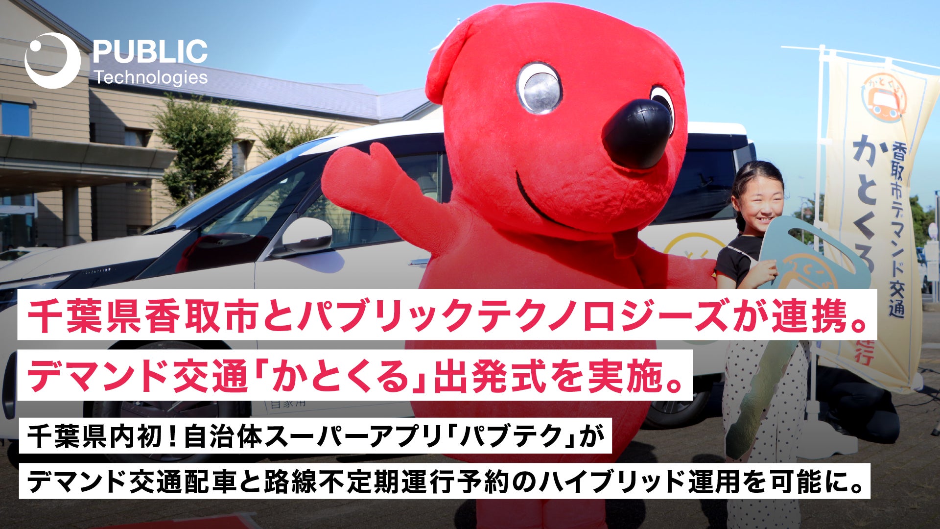 地方自治体に特化した公共ライドシェアサービスや自治体向けスーパーアプリ「パブテク」を開発・運営する株式会社パブリックテクノロジーズ(本社:東京都中央区 代表取締役CEO:青木大和、以下、「当社」)は、香取市が運行する、自家用有償旅客運送を活用した「香取市デマンド交通(愛称:かとくる)」の運行業務を受託しました。また、2024年9月26日(木)には香取市役所山田支所前にて出発式が執り行われ、当社代表取締役CEOの青木大和が挨拶をいたしました。