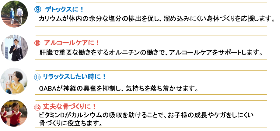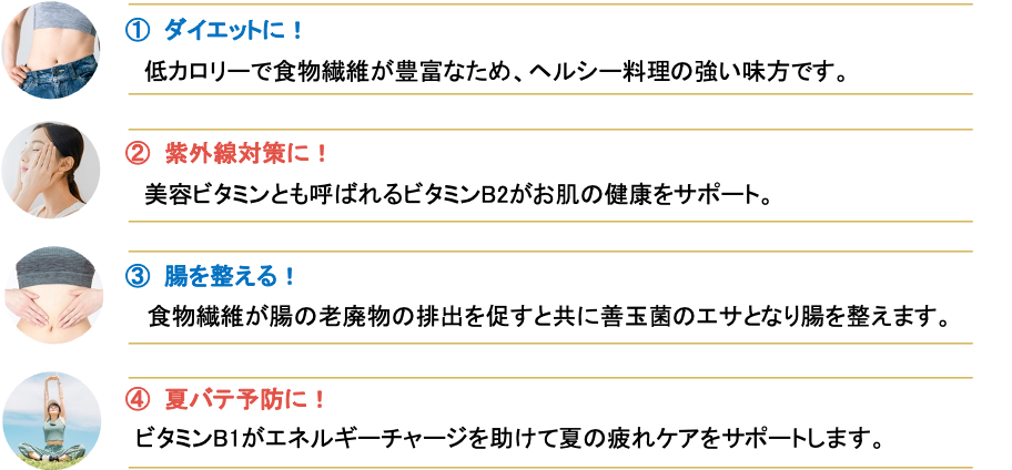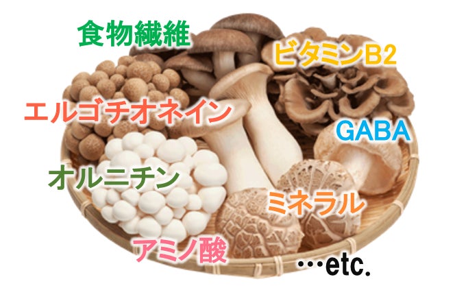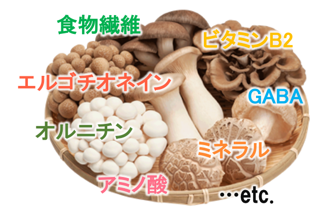 また「菌食材」のきのこは、腸活に役立つ「食物繊維」の他にも、肌活に役立つビタミンB2やエルゴチオネイン、眠活に役立つGABAやオルニチンなど、ビタミン・ミネラル・アミノ酸といった様々な栄養素を含んでいます。これが、菌活が様々な活動を叶えられる理由でもあります。