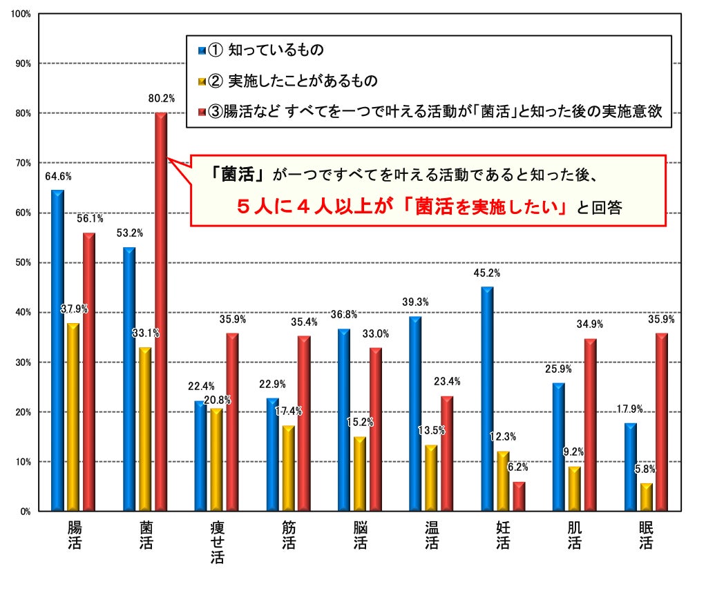 美容・健康に関する「○」活に関して、①知っているもの、②実施したことがあるもの、③腸活などすべてを一つで叶える活動が「菌活」と知った後の実施意欲についてアンケート調査を実施したところ、以下のような結果となりました。