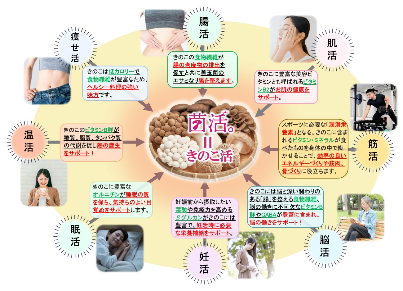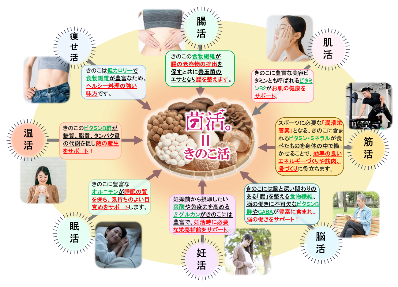 「菌活」とは、きのこを食べて、身体の内側から健康で美しくなる「きのこ活」のことであり、腸活、肌活、筋活、脳活、妊活、眠活、温活、痩せ活などすべての理想を叶える生活習慣です。「菌」は訓読みで「きのこ」と読むように、菌類であるきのこは菌そのものだけを食べられる唯一の食材で「菌食材の王様」と呼ばれています。