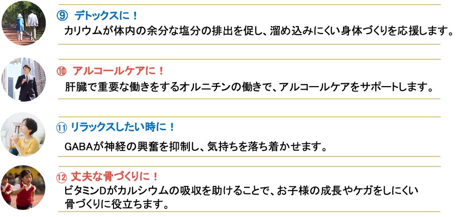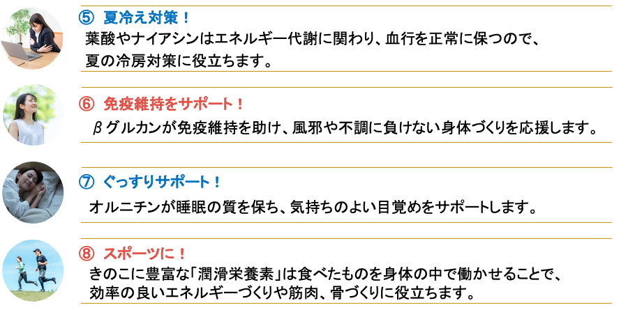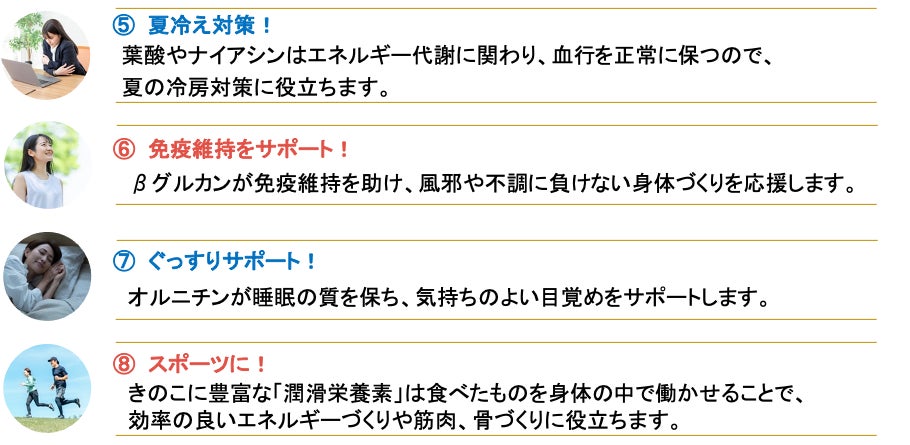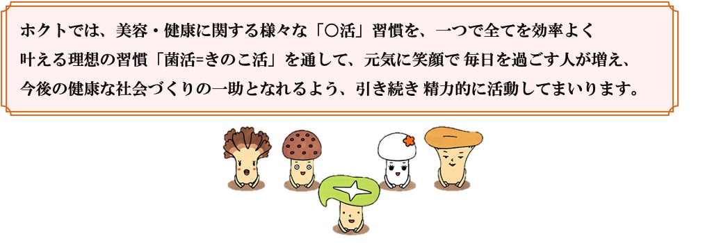 きのこには、食物繊維、ビタミンB群、エルゴチオネイン、オルニチン、GABA、βグルカン、ビタミンD、カリウムなど多くの栄養素が含まれ、整腸作用、 美肌、筋肉・骨づくり、脳の働きのサポート、免疫維持、快眠、代謝アップ、ダイエット、夏バテ予防など様々な効果効能があり、「菌活」は美容・健康に関する全ての理想を叶えてくれる習慣です。