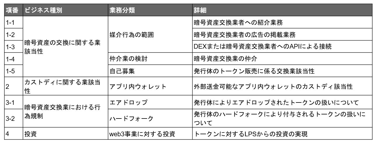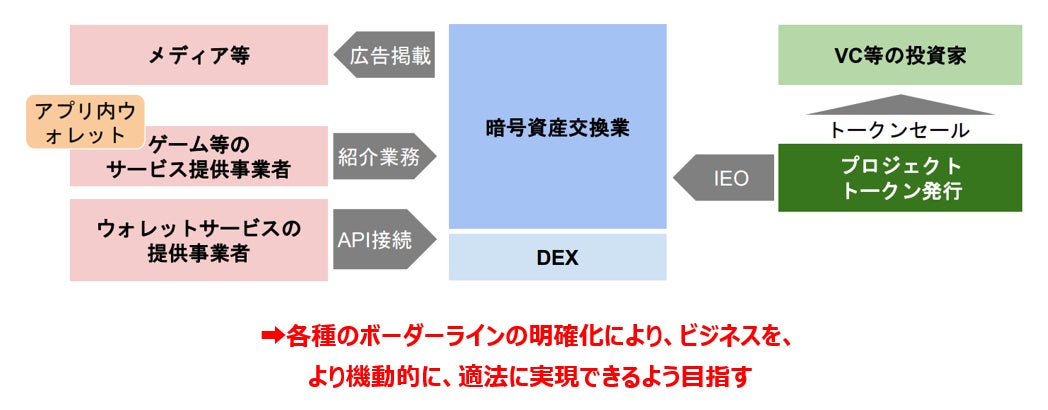 紹介や広告掲載業務、暗号資産交換業の仲介、発行体のトークン販売に係る交換業該当性、アプリ内ウォレットのカストディ該当性などを明確化すること、機動的かつ適法なweb3ビジネスの実現に向け、事業者で活動中