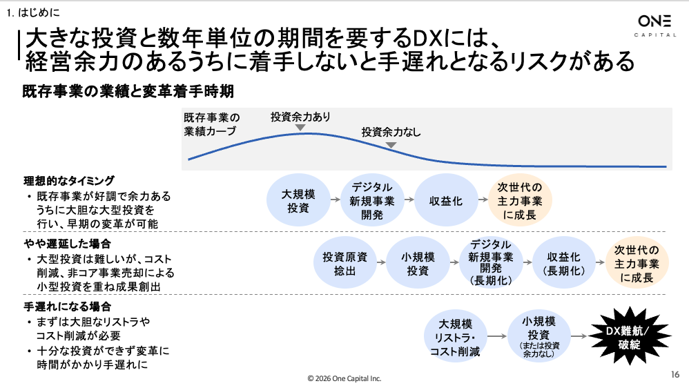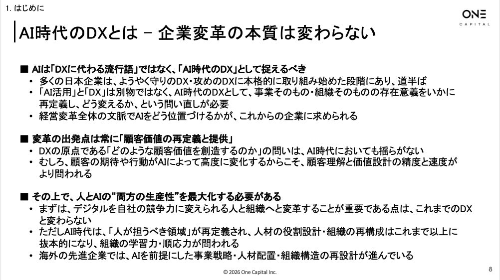 しかし依然として、多くの企業がその重要性を認識しながらも、具体的な進め方が見えず、実践に苦戦しているのが現状です。そこでOne Capitalは、これまでの支援を通じて培ったDX推進の実践知を基に、AI時代の前提条件を織り込んだ全社DXの型を「DX Playbook 2026」として体系化いたしました。このPlaybookは、経営層をはじめDXに携わるすべての人々に向けた指南書として、企業のDX推進を支える羅針盤となることを目指しています。