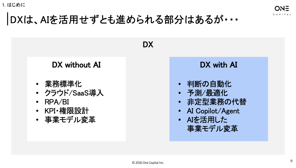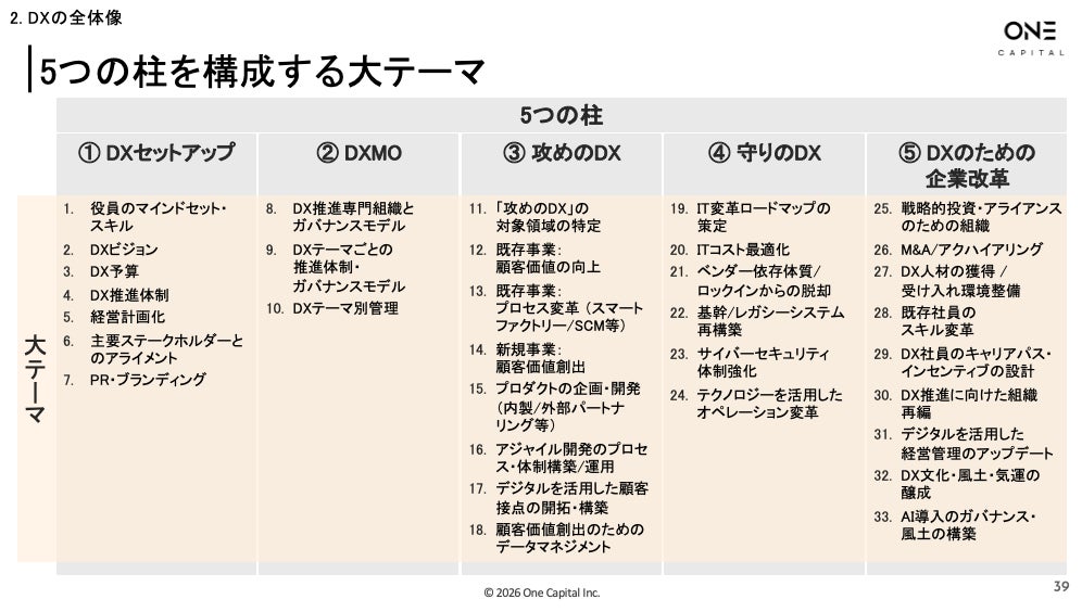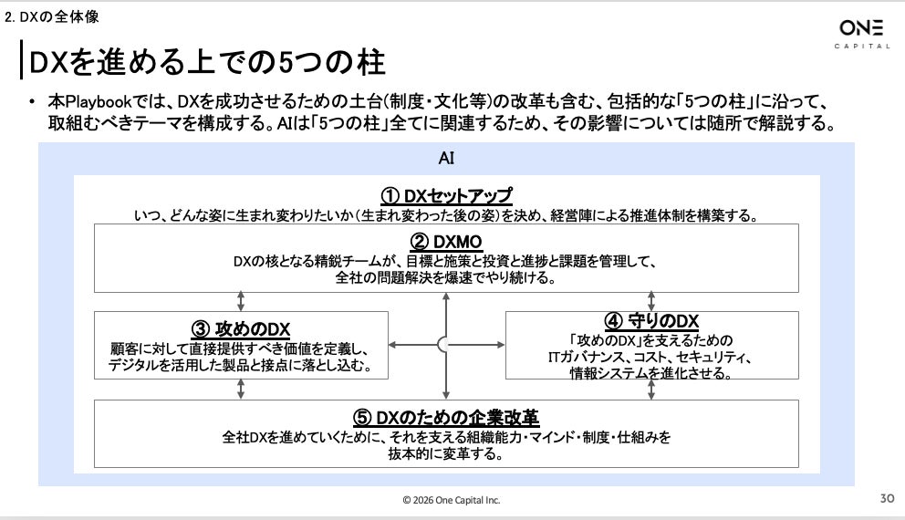 B2B SaaSをはじめとしたスタートアップへ出資するOne Capital株式会社(本社:東京都港区、代表取締役CEO:浅田慎二)は、この度、当社DXアドバイザリーチームによる長年にわたるDX支援の知見を体系化した190ページを超える実践ガイド「DX Playbook」の2026年版を作成し、無料公開しました。