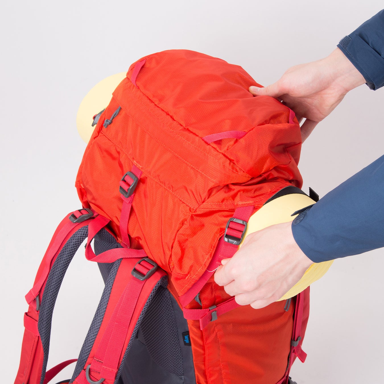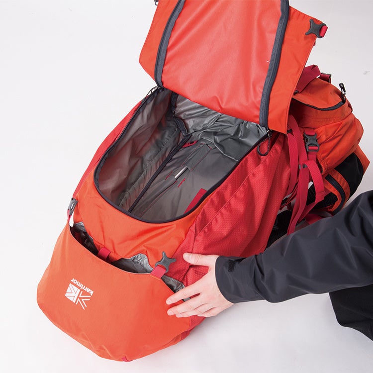 止水ジッパーでU字型に大きく開口するフロントアクセス仕様に。荷物の視認性が上がると同時に荷室下部に収納したものへのアクセス性も高まるのでテントや小屋内での装備の出し入れが容易になります。