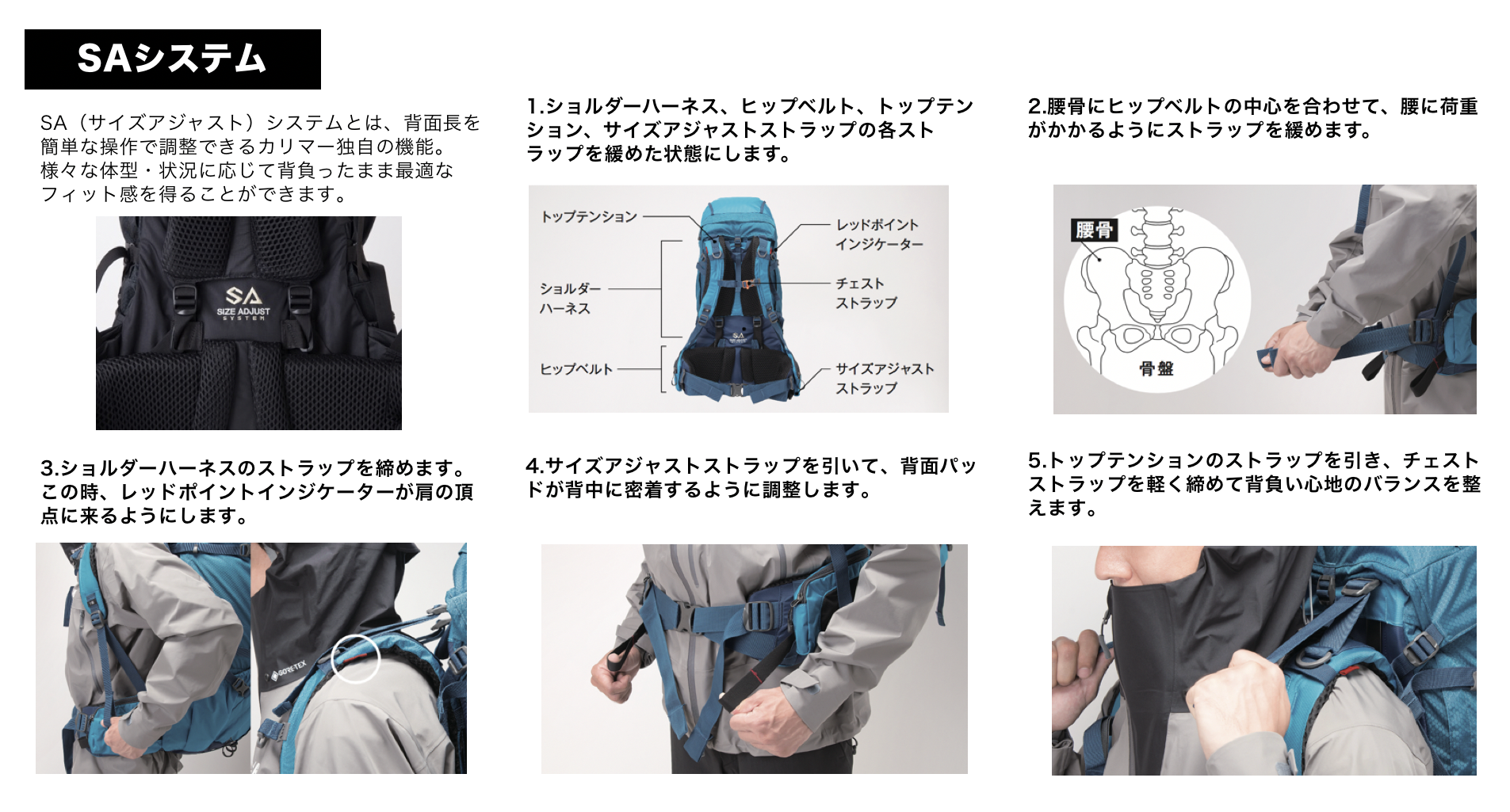 テント泊や長期縦走向けの大容量モデル。背面長を背負いながら無段階調整出来るSA(サイズアジャスト)システムを搭載し、素早いフィッティングと安定感のある背負い心地を実現。長年親しまれてきた名称を今季より、 Apex=頂点を追加し〈CougarApex〉にアップデート。大幅な軽量化で、さらに使いやすさを追求しました。