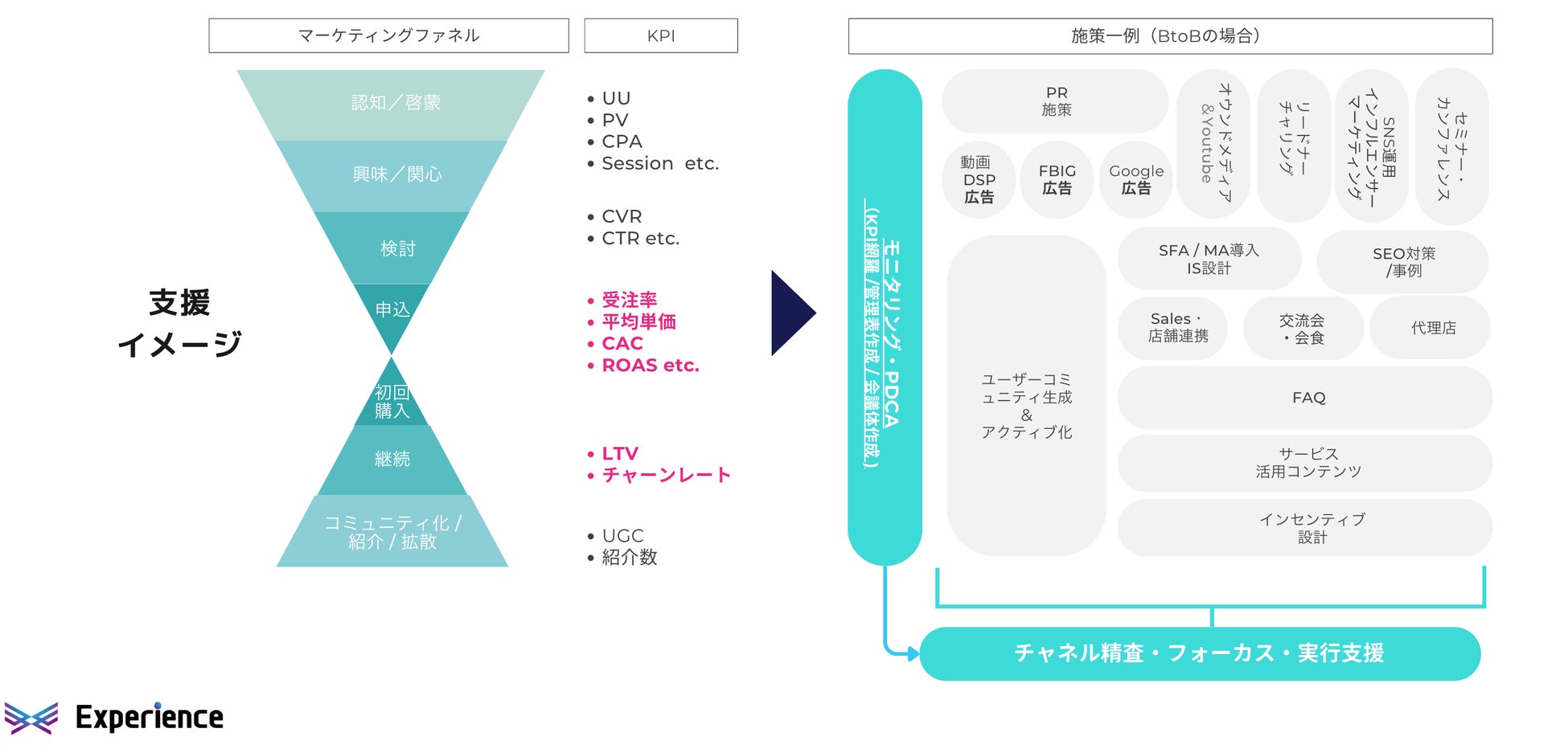 受注やLTV向上から逆算して、成果があるチャネルを精査 > 立案。全体を通してモニタリング・PDCA体制を作り上げ適切なチャネルにフォーカスします。