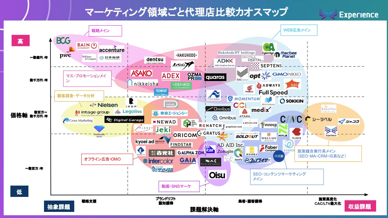 株式会社 Experienceがマーケティングにおける代理店・支援会社のカオスマップ(総計91社)と発注先の比較検討を行う際のポイントを無料ダウンロードコンテンツとして公開