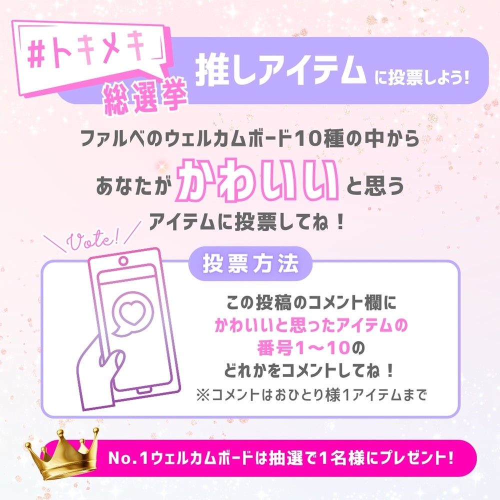 ファルベからエントリーした新作を含む10種類の人気ウェルカムボード中から人気No.1を決め、みんなでトレンドを作ろうというInstagram企画です。抽選で1位に輝いた商品のプレゼントもご用意しております。