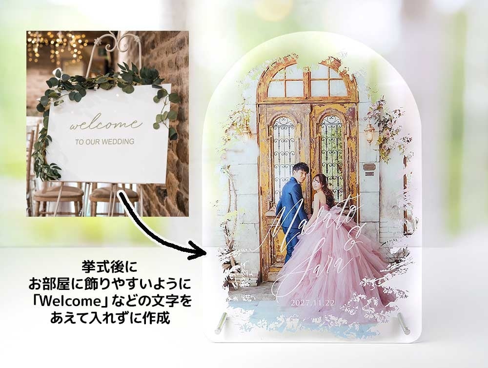 挙式後にご自宅で飾ることを考えて、あえて「Welcome」の文字が印字されていないデザインにしたこともポイントです。