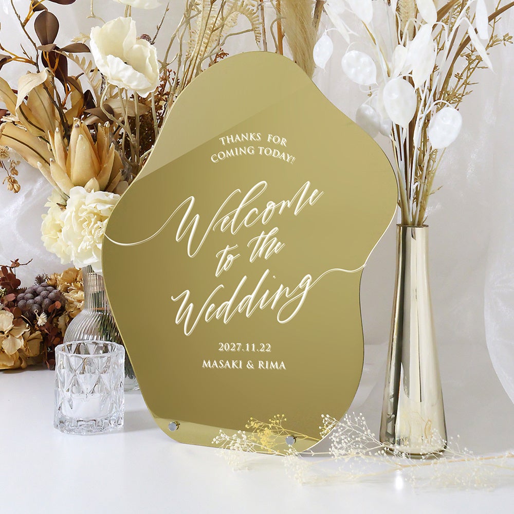 「韓国っぽ」を意識したウェーブ型のミラーウェルカムボード。うねうねとした独特な形がユニークでおしゃれなデザインで、ミラーの輝きがウェルカムスペースをより一層華やかに演出してくれます。