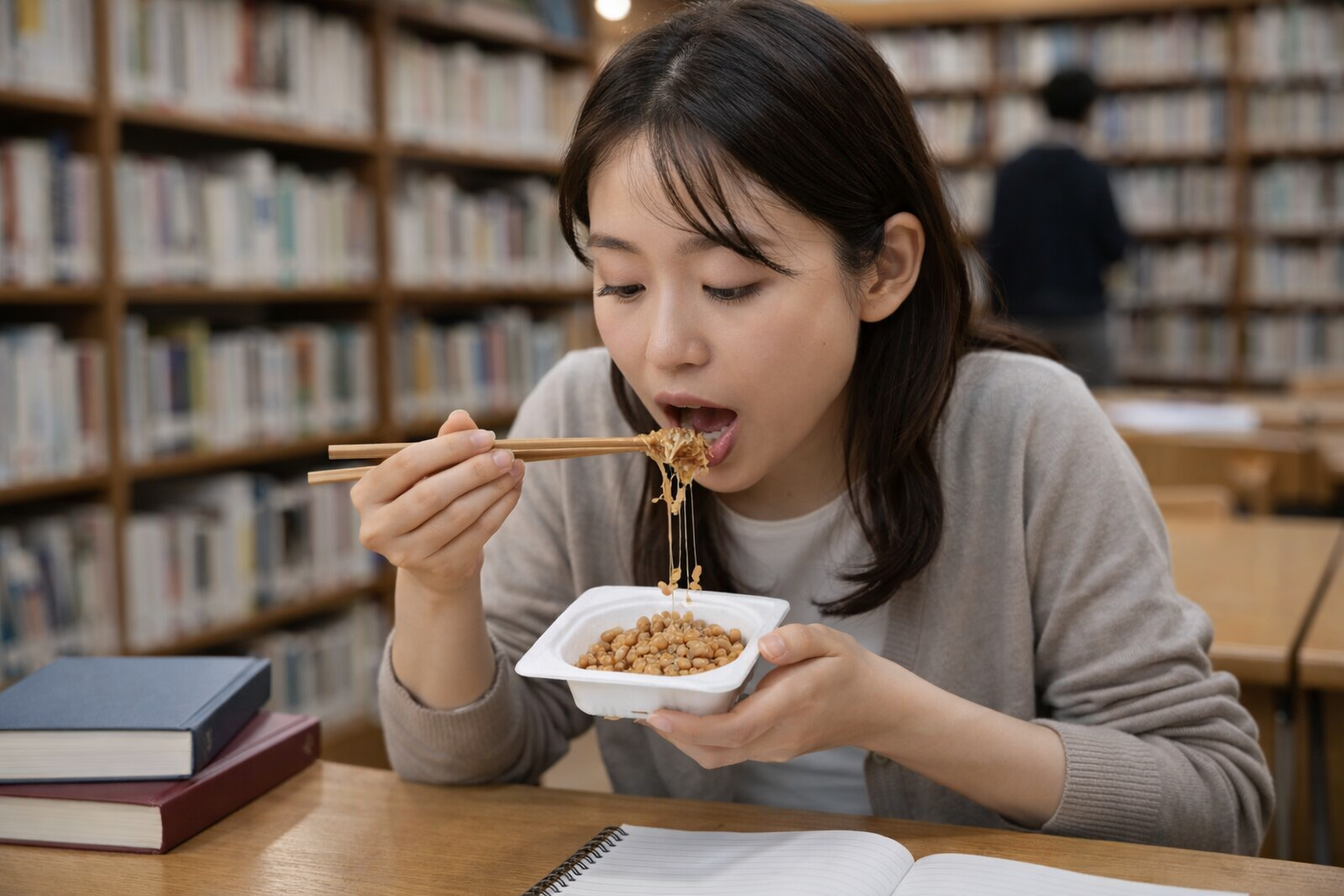 本当はダメだとわかっている。だけど、朝からずっと食べたかったのだ。納豆。箸で持ち上げると、糸がやたら元気に伸びて、思わず笑いそうになる。そのとき向かいの席の男子が、ちらっとこちらを見た。「……納豆、好きなんだ?」小声でそう言われて、私はちょっとだけ赤くなる。