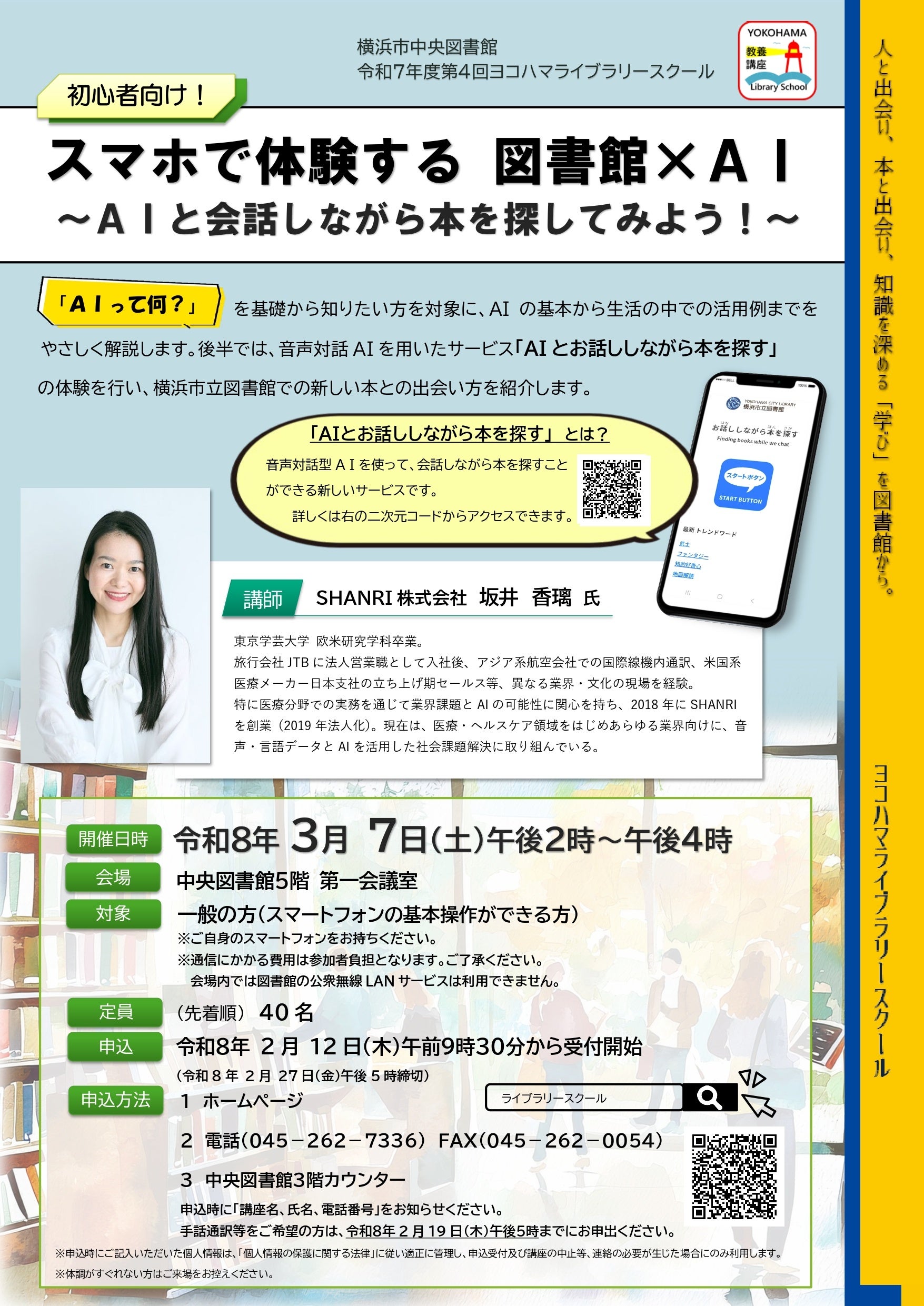 2026年3月7日、横浜市中央図書館で開催された「ヨコハマライブラリースクール」教養講座において、AIをテーマとした講義と「AIとお話ししながら本をさがす」体験プログラムを実施しました。