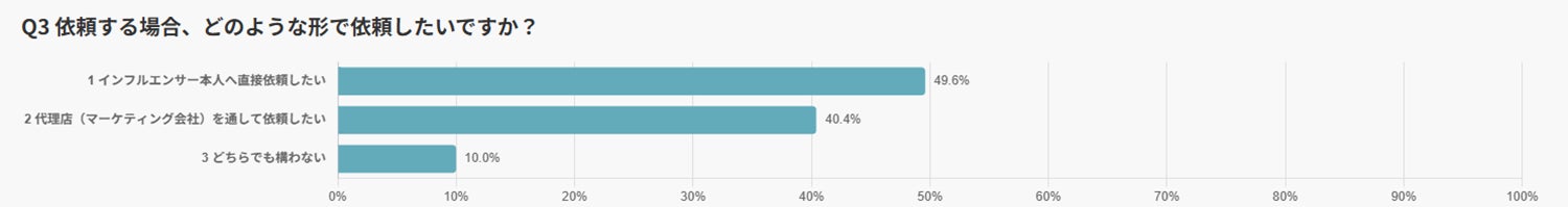 インフルエンサーや代理店に依頼したいと考える人に、どのような形で依頼したいかを尋ねたところ、「直接依頼したい」と答えた人が49.6%と最も多く、「代理店を通じて依頼したい」との回答が40.4%で続きました。