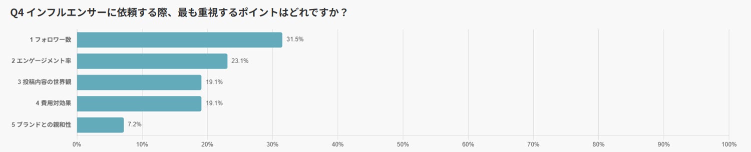 インフルエンサーを選ぶ際にどのポイントを重視するか尋ねたところ、最も多かったのは「フォロワー数」(31.5%)でした。