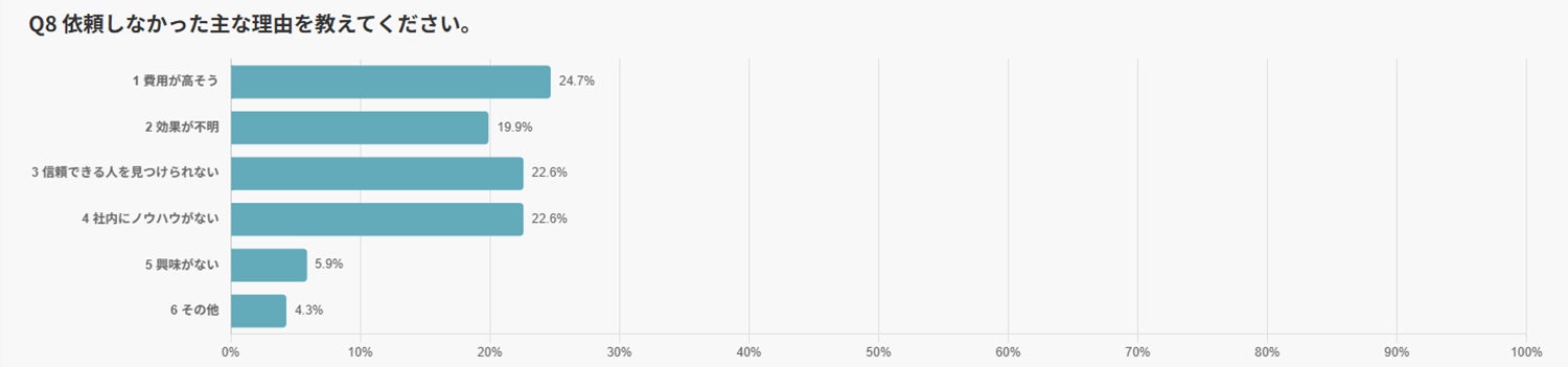 費用面や成果の測定、信頼できる相手を見つけにくいといった課題が影響している可能性が高いです。
