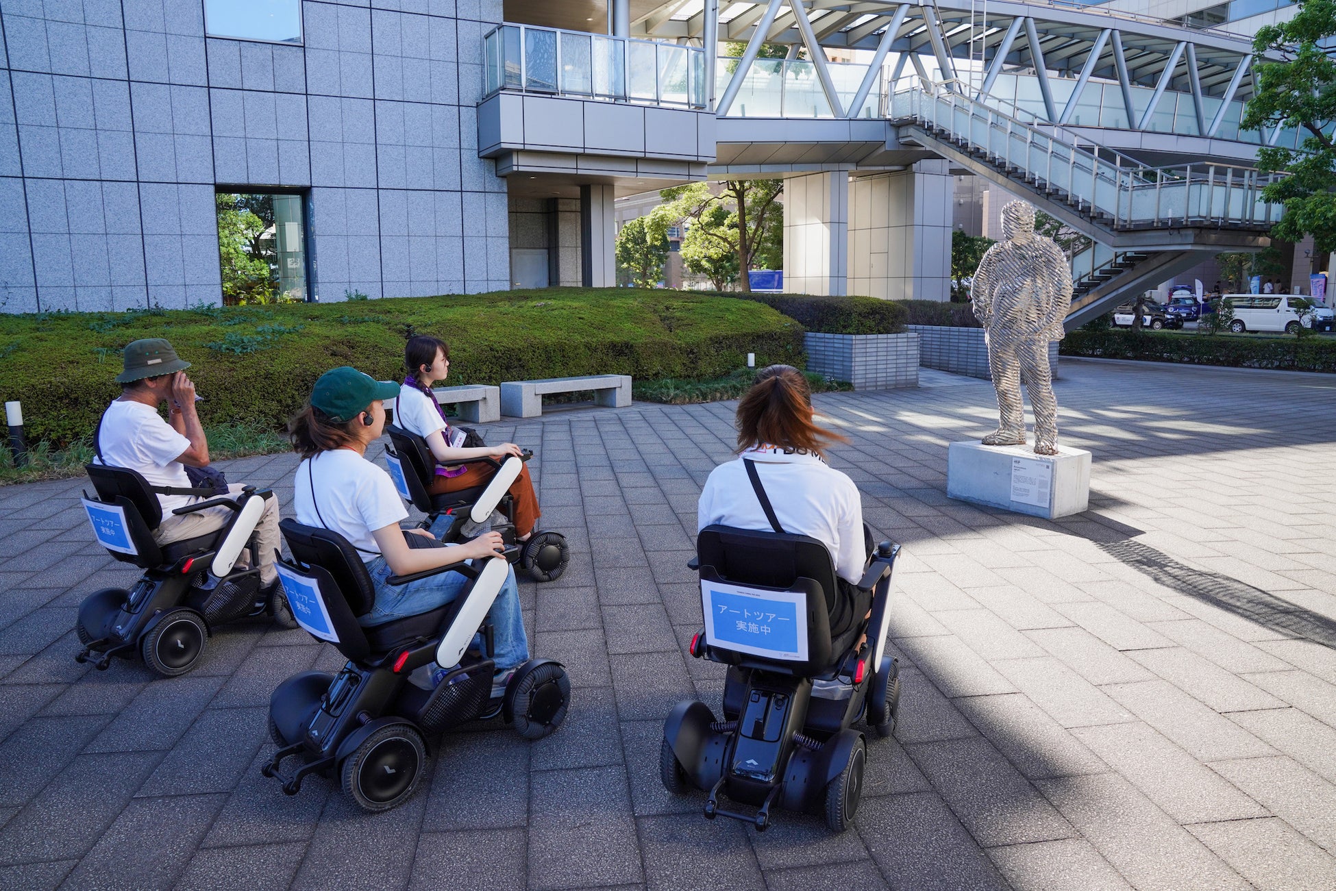 天王洲地区に点在するアート作品を近距離モビリティ(電動車椅子・電動キックボード)に乗り、自ら操縦して巡る体験型ツアーの実証実験をしました。パナソニックグループの「Smart Town Walker®」のイベントアバターによる音声・映像付きガイダンスと跡見学園女子大学篠原ゼミ生が、アバターのガイダンス後に、アート作品製作に関する秘話やアーティストの人間性に触れる解説により、このツアーの魅力を向上させ、稼ぐ観光商品としての磨き上げを図っています。現在、このアートツアーは、観光商品として販売されています。