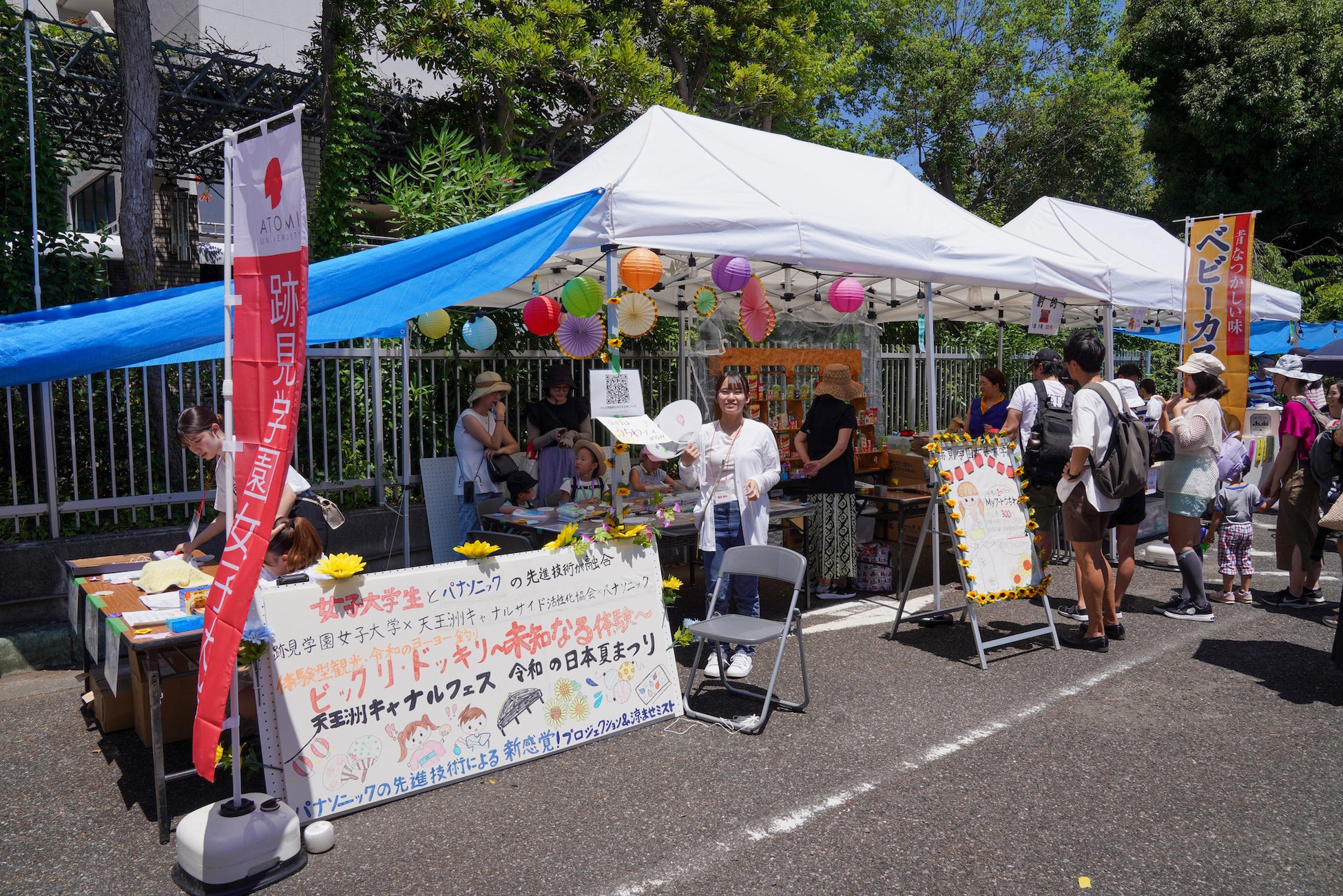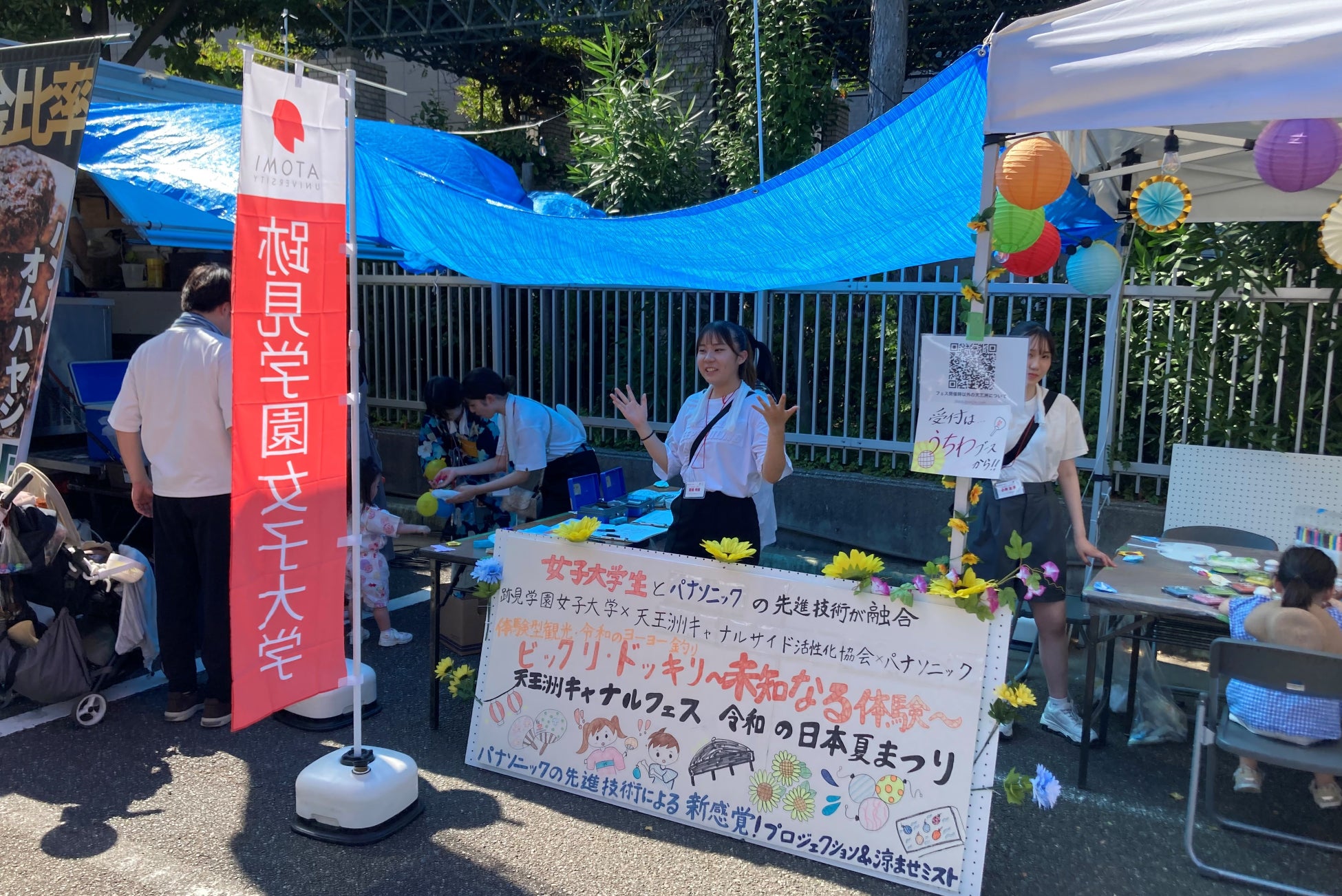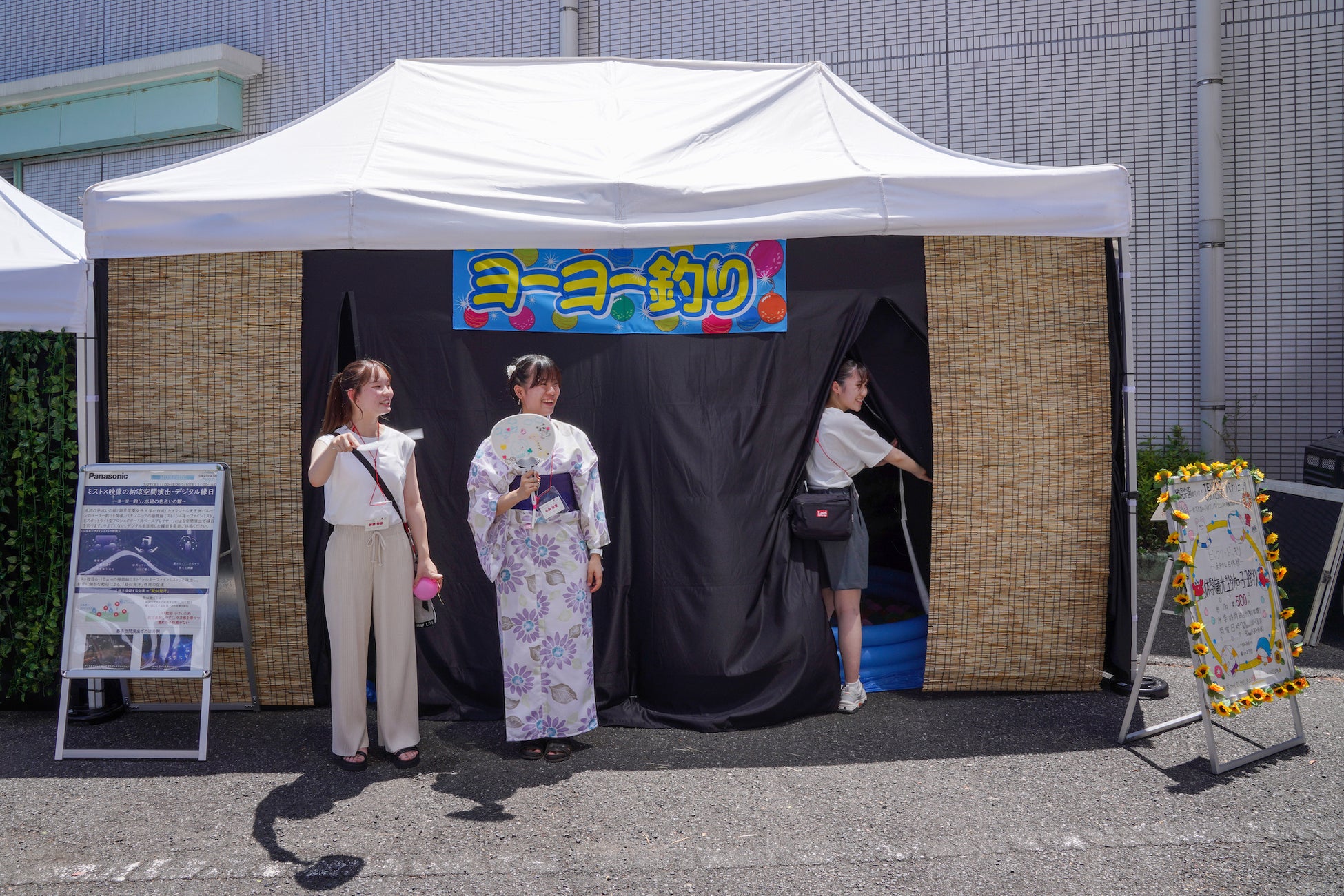 跡見学園女子大学観光コミュニティ学部篠原ゼミの縁日コンテンツに、パナソニックの先進技術を組み合わせた新感覚ヨーヨー釣りを実施しました。昭和を代表する夏の風物詩であるヨーヨー釣りを映像プロジェクションと極微細ミストのテクノロジーで演出を行い、令和版のヨーヨー釣りに進化させました。この演出により、日本の夏の味わいと未知なる「ビツクリ・ドッキリ」体験を融合する令和の縁日を実現させています。