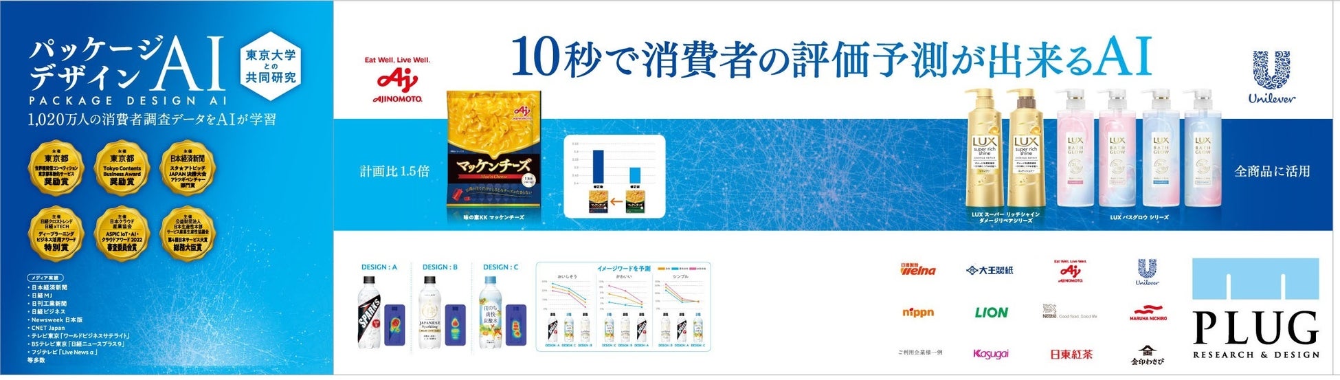 大手食品や菓子、飲料、トイレタリーメーカーなどで採用され、本AIを使用した商品の売上が大きく伸びたことが話題になっています。日本サービス大賞 総務大臣賞や日本経済新聞や東京都主催の各賞を受賞。