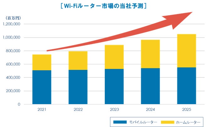 スマートフォン普及等に加え、固定系ブロードバンド(光回線等)の代替となるホームルーター、モバイルWi-Fiルーター等の「Wi-Fiルーター」の普及が要因です(※2)。Wi-Fiルーターは、5G対応による固定系ブロードバンドと機能面の差異縮小に加え、「工事不要」等の利点があり、今後も普及拡大が見込まれています。2025年には1.1兆円の市場規模(※3)になると当社は予測しております。