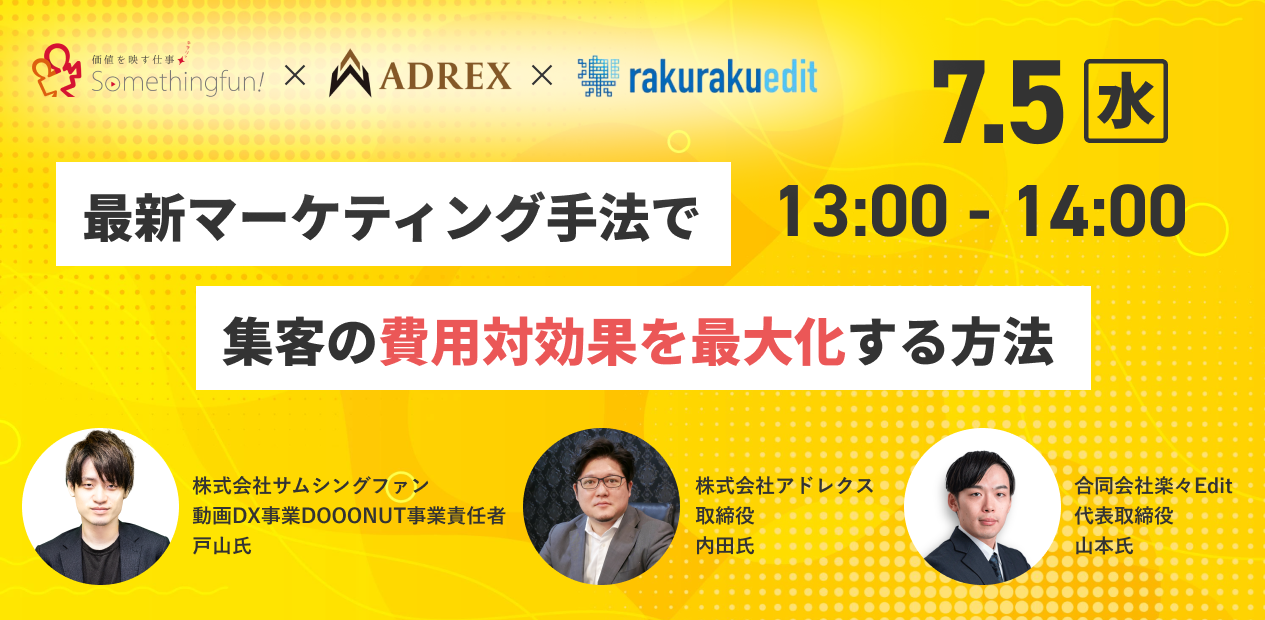 株式会社サムシングファンと合同会社楽々Editとアドレクスの3社から、多角的な最新マーケティング手法を学ぶことが出来るまたとない好機です。是非この機会にご参加お申込みください。