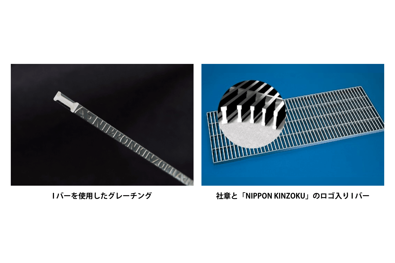 当社のグレーチング部材製品は異形圧延による『Iバー』、軽量で溶接仕上げの『Tバー』を中心に好評を頂いております。特にIバーは、グレーチング部材製品において、フラットバーと比較すると、中央部の板厚を薄くすることで軽量化及びコストの削減が可能なうえ、圧延時の加工硬化により耐久荷重も優れています。また、特長として、踏み面にローレット模様や特殊な凹凸模様を施し、滑り止め防止※とともに意匠性・外観を向上させる機能を有していることが挙げられます。このたびこれをさらに発展させ、文字やマーク、模様等を施すことで、様々なデザインに対応する製品を開発いたしました。