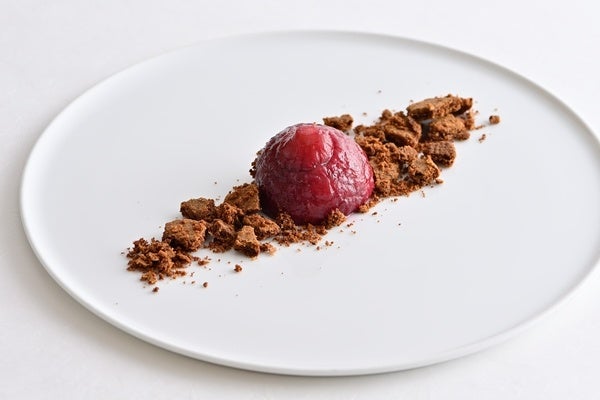日本の伝統料理「イカ飯」をアレンジ。やわらかく煮た無花果の中に、白餡で和えたカルローズの冷たいリゾットを詰めた新感覚デザート。