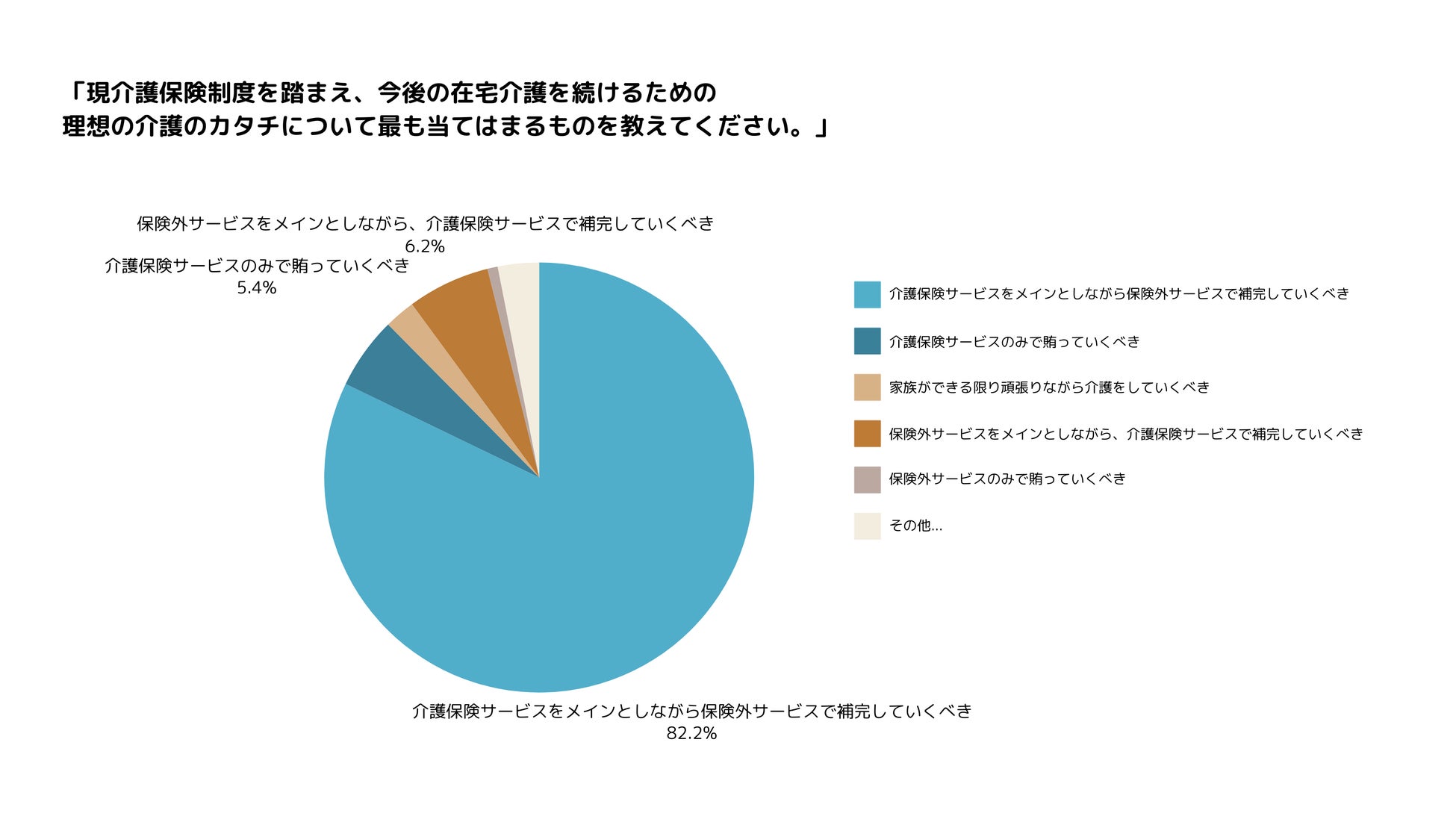 介護保険だけではニーズが賄えていないことを踏まえ、在宅介護の理想の形について、82.2%が「介護保険サービスをメインに保険外サービスで補完すべき」と回答。家族介護の負担を最小限にしながら在宅介護を続けるためには、両者を組み合わせる柔軟なアプローチが必要であるとの意識が広がっている。