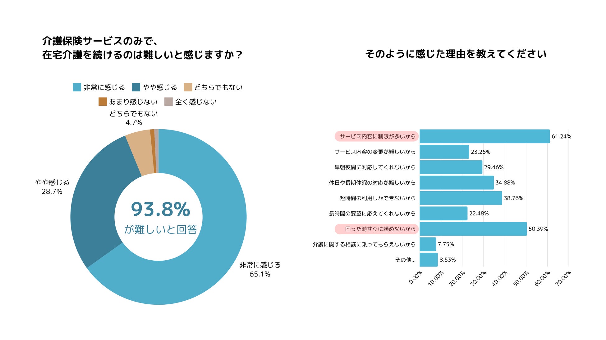 「介護保険サービスのみで、在宅介護を続けるのは難しいと感じますか?」に対して、93.8%が「難しいと感じている」と回答。主な理由としては「サービス内容に制限が多いから」(61.24%)が最も多く、「困った時にすぐ頼めないから」(50.39%)が次いで多かった。
