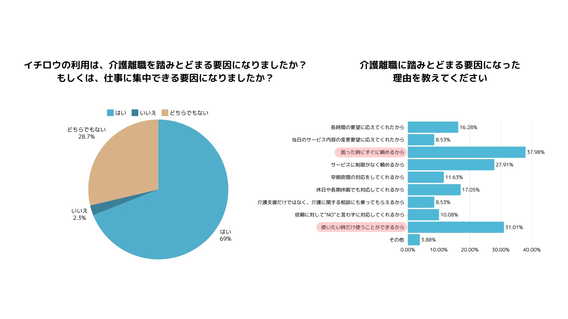 利用者の69%が「イチロウの利用は、介護離職を踏みとどまる要因になりましたか?もしくは、仕事に集中できる要因になりましたか?」に対し「はい」と回答。主な理由としては「困った時にすぐに頼めるから」(37.98%)が最も多く、「使いたい時だけ利用できるから」(31.01%)が次いで多かった。