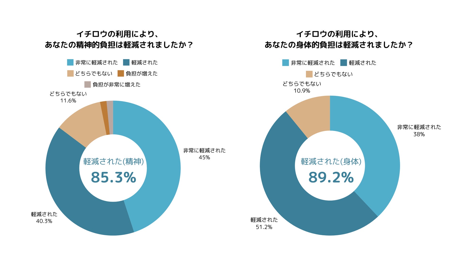 ・イチロウの利用者の85.3%が「精神的負担が軽減された」と回答、89.2%が「身体的負担が軽減された」と回答。