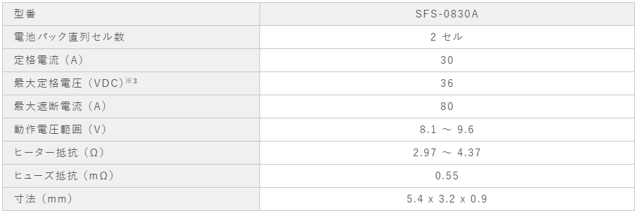 このたび製品化した「SFS-0830A」は、製品の構造を最適化することで、ヒューズ抵抗0.55mΩ、製品サイズは横幅5.4 mm、縦幅3.2mm、厚み0.9mmと、低抵抗化と小型化を同時に実現した製品です。従来の定格電流30AのSCP※1と比較して57%の低抵抗化、21%の小型化に成功しました。ヒューズ抵抗が低く、ヒューズ自体の発熱や消費電力を抑えられるため、搭載端末の長時間駆動が可能であること、小型で限られたスペースでの実装も可能であることから、急速充電対応のスマートフォンに適しています。また、30A対応で、電動工具やコードレスクリーナー、電動バイクなど比較的大きな電流が要求されるアプリケーションに幅広くご使用いただけます。