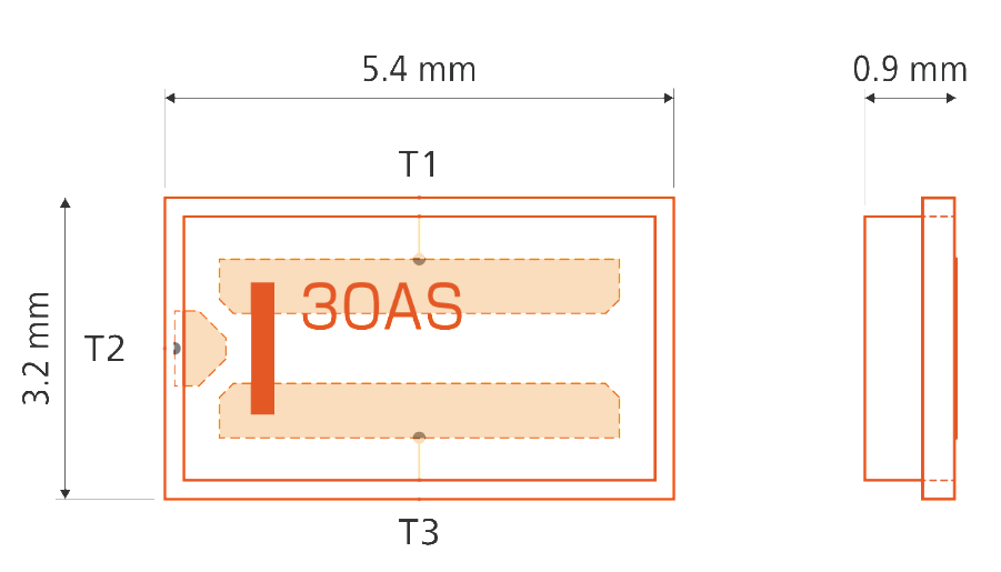 定格電流が30Aの製品としては最小かつ最薄となる横幅5.4 mm、縦幅3.2mm、厚み0.9mmの製品サイズで、従来品※1比21%の小型化・薄型化を実現