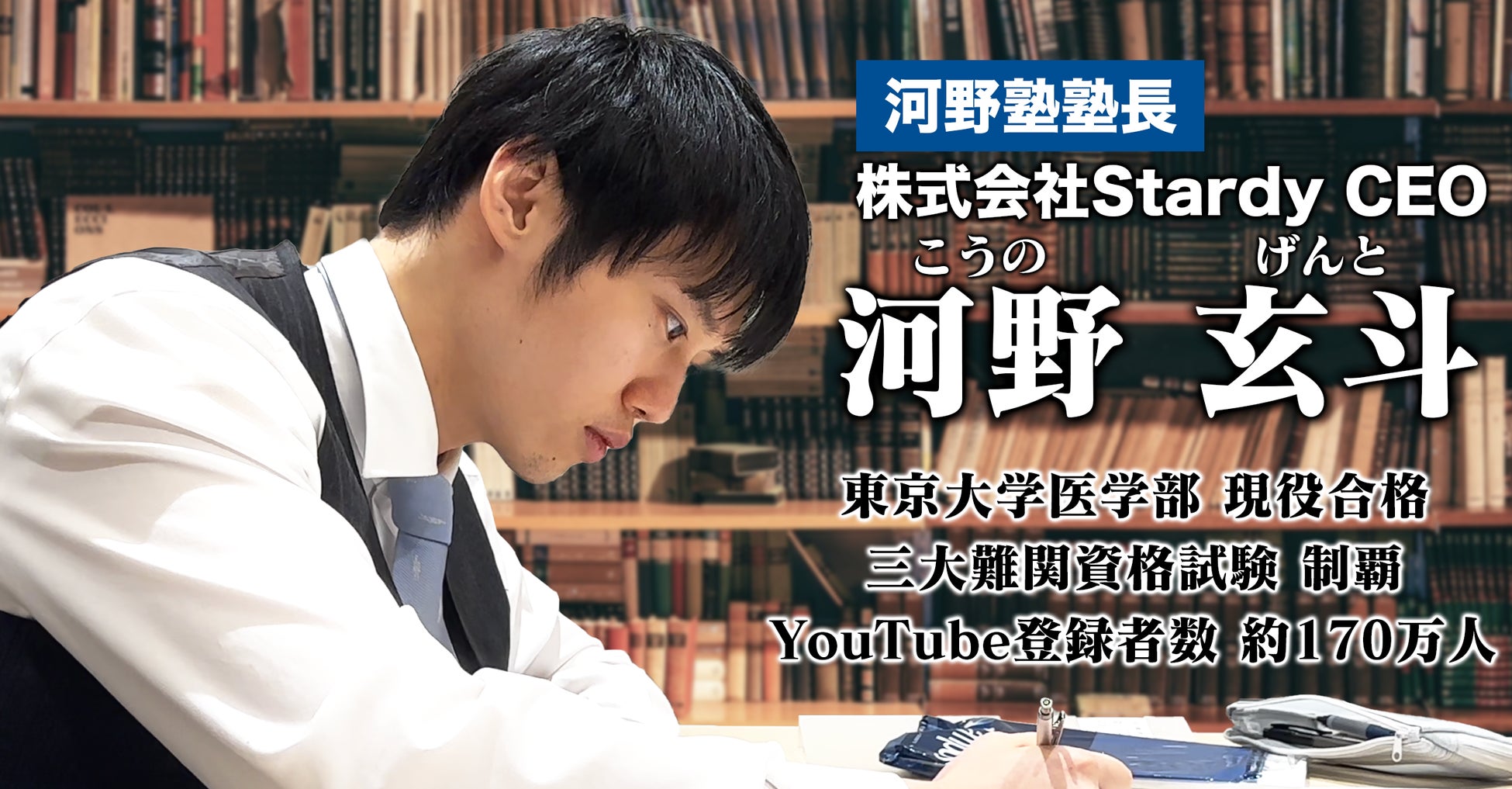 河野は、東京大学理科Ⅲ類医学部に現役合格。在学中に司法試験に合格し、医師国家試験にも合格。2022年、公認会計士に挑戦し11月資格を取得。同年、河野塾を開校。「東大医学部の神脳」と呼ばれた東大医学部在学中から教育系YouTuberとして『Stardy -河野玄斗の神授業』をスタート。タレントとしても各メディアに出演。河野のYouTubeは登録者数170万人(2025年12月現在)を誇り、今も自ら学び挑戦する姿に多くの支持を得ています。