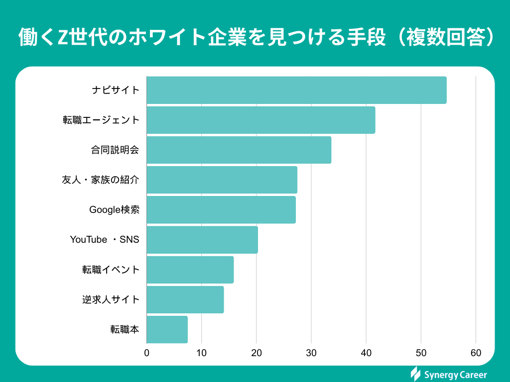 ・Z世代がホワイト企業を探す手段として多いのは「ナビサイト」「転職エージェント」「合同説明会」